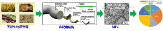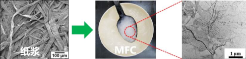 随着“禁塑令”的实施,“以纸代塑”已成为全球包装产业的主要发展方向之一。纸包装制品作为一种源于自然又回归自然的环保产品,符合可持续发展的理念,但仍存在机械强度低、阻隔性差等缺点。微纤化纤维素(MFC)是主要以植物纤维为原料,经机械解纤得到的具有一维纳米尺度的纤维素材料。它兼具纤维素和一维纳米材料的优点,如表面丰富的羟基、高长径比、大比表面积、高机械强度及可生物降解等。凭借独特的微纤结构和物化特性,近年来MFC在增强材料、功能材料方面受到学术界和工业界的高度关注,尤其作为一种“绿色”添加剂,有望替代造纸工业不可降解的石化类助剂,助力其低碳、可持续发展(如图1所示)。然而,MFC的尺寸结构与表面性质调控、基于MFC纳米效应的湿部化学系统的构建及其纸页高效脱水技术的开发,已成为基于现代高速纸机平台生产高性能包装纸的关键技术瓶颈。