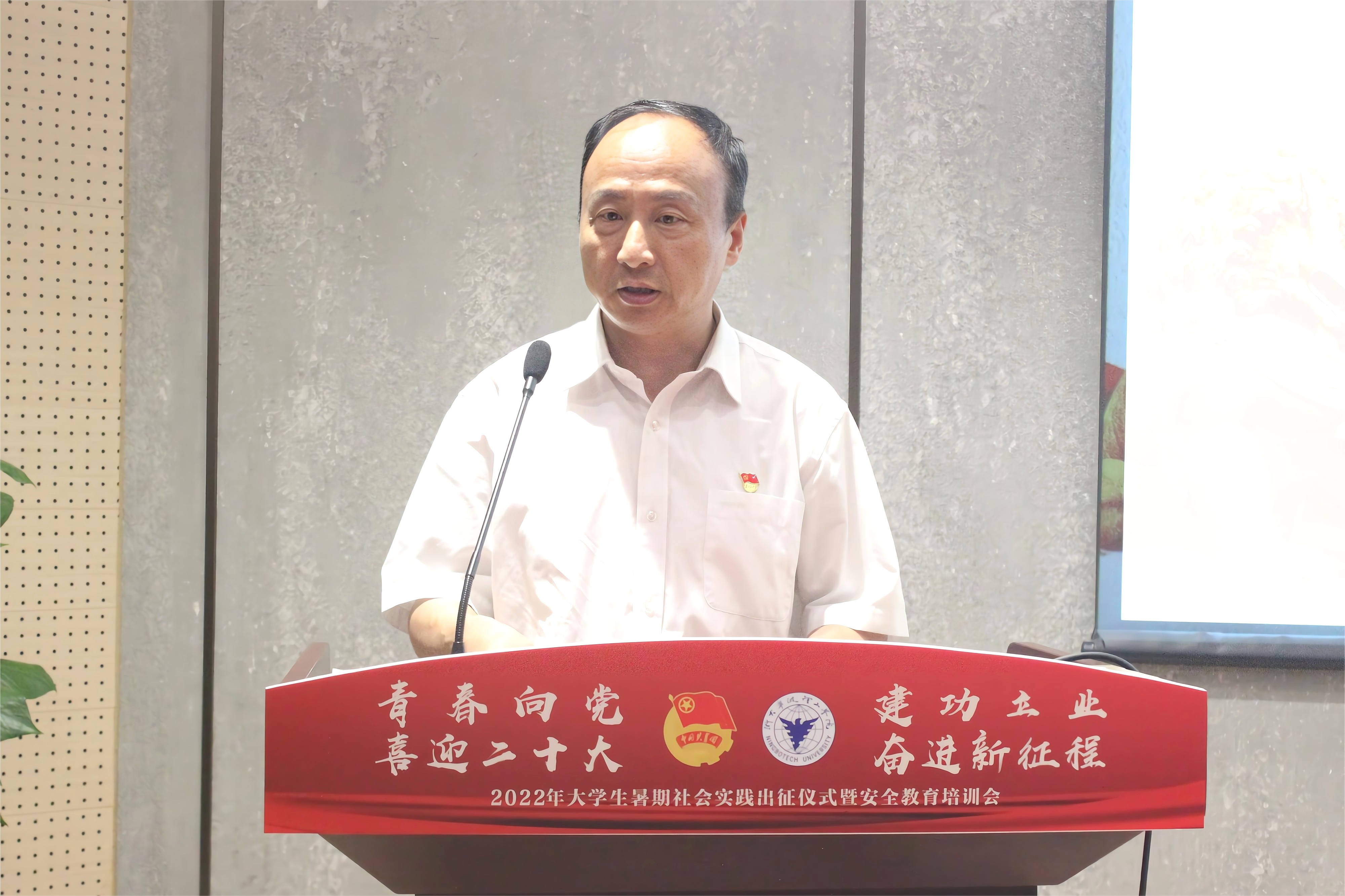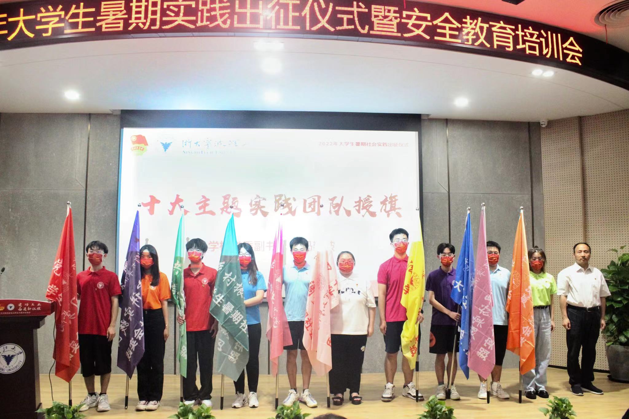 冯建波作动员讲话,并为十大主题团队代表授旗。他指出,暑期社会实践是引导和帮助广大青年学生上好与现实相结合的“大思政课”的重要途径。2021年,2800余名同学参加了156个社会实践团用脚步丈量祖国的大地,奔赴全国40余个城市开展了26208小时的实践活动,获得了浙江省“优秀团队”3项、宁波市大中学生“双百双进”暑期社会实践表现突出团队7个、表现突出个人11人。今年是党的二十大召开之年,136个团队、2500余名青年围绕“共同富裕”“乡村振兴”“民族团结”等十大主题加入到暑期社会实践队伍中,他希望青年学子们:一是要坚定理想,以信仰之光坚守使命担当。同学们要积极践行总书记关于“立大志、明。大德、成大才、担大任”的殷切嘱托,把青春的生机与活力、担当与奉献融入到实现中华民族伟大复兴的生动实践中去;二是知行合一,以青春之名奔赴祖国山河。同学们要在实践中上下求索,向实践学习、向群众学习,守好红色根脉,争做时代新人。三是踔厉奋发,以奋斗之力点亮青春底色。同学们要接过迈向新征程的接力棒,以服务奉献为荣、以吃苦耐劳为乐,在为祖国、为社会、为人民的服务奉献中,克服挑战、锤炼品格。