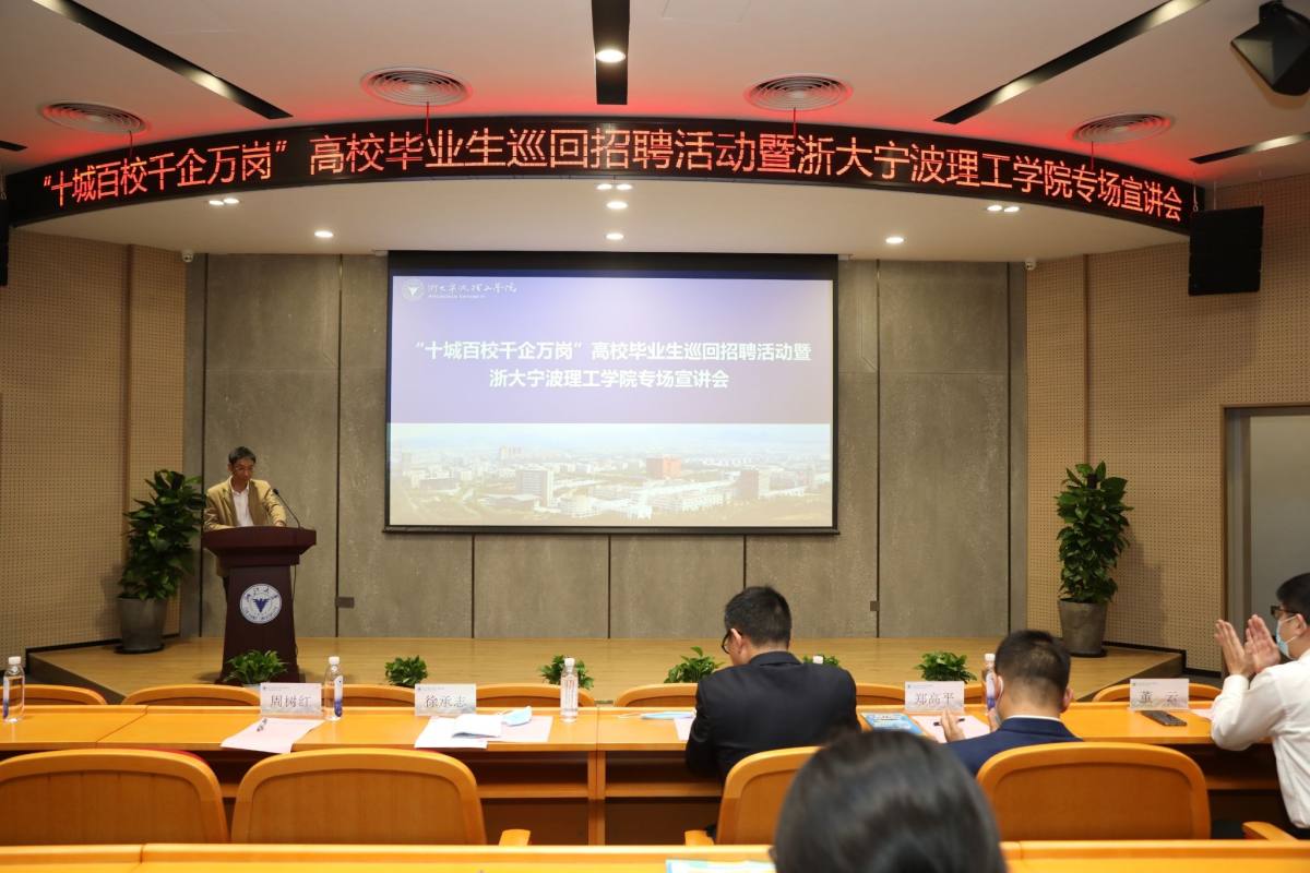 高校毕业生就业关系民生福祉、经济发展和国家未来。为贯彻落实党中央、国务院决策部署,做好当前和今后一段时期高校毕业生等就业创业工作,5月13日下午,“十城百校千企万岗”高校毕业生巡回招聘活动暨浙大宁波理工学院专场宣讲会在学校启新大讲堂召开。学校副校长鲁东明,宁波市人社局党组成员、副局长徐承志,宁波市委组织部高层次人才服务中心主任郑高平,宁波市人才服务中心专职副书记董云,宁波市人才服务中心副主任徐炬磊,宁波单项冠军企业宁波永新光学股份有限公司人事行政部经理张雪枫,校友企业宁波市鄞州区银巢老年产业发展有限公司董事长李靖慧参加了会议,会议由学校党委委员、组织部部长周树红主持。