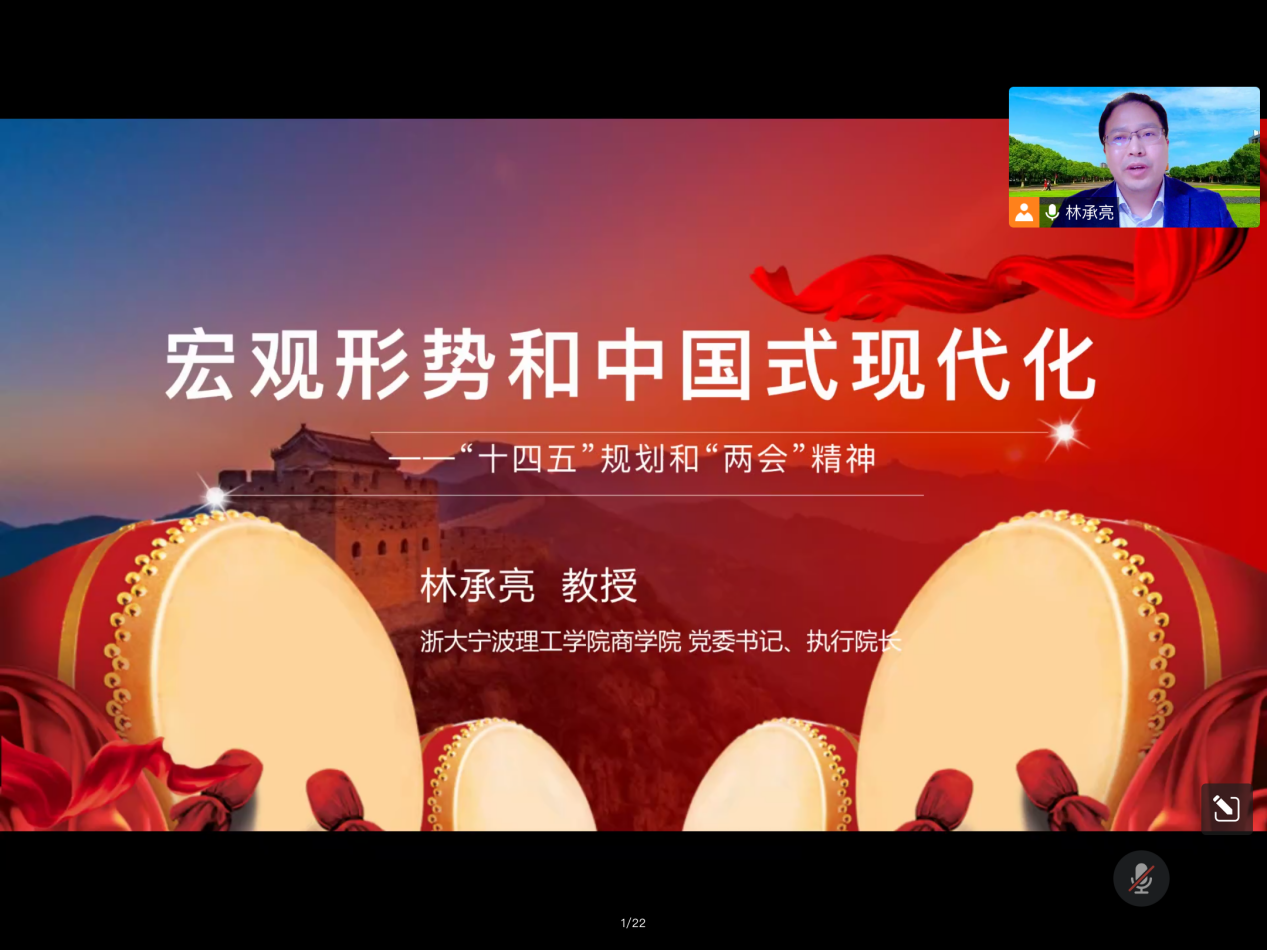 林承亮以“宏观形势和中国式现代化”为主题,聚焦“十四五”规划和两会精神,通过解读党的十九届五中全会公报和“十四五”规划纲要对国际国内形势进行总体判断;带领同学们深度学习了全国两会政府工作报告,分析形势趋紧的内外原因。通过学习,同学们充分认识到中国式现代化的五个特征,明白了实现中国式现代化的两大抓手是打造“双循环”新发展格局和科技自立自强。