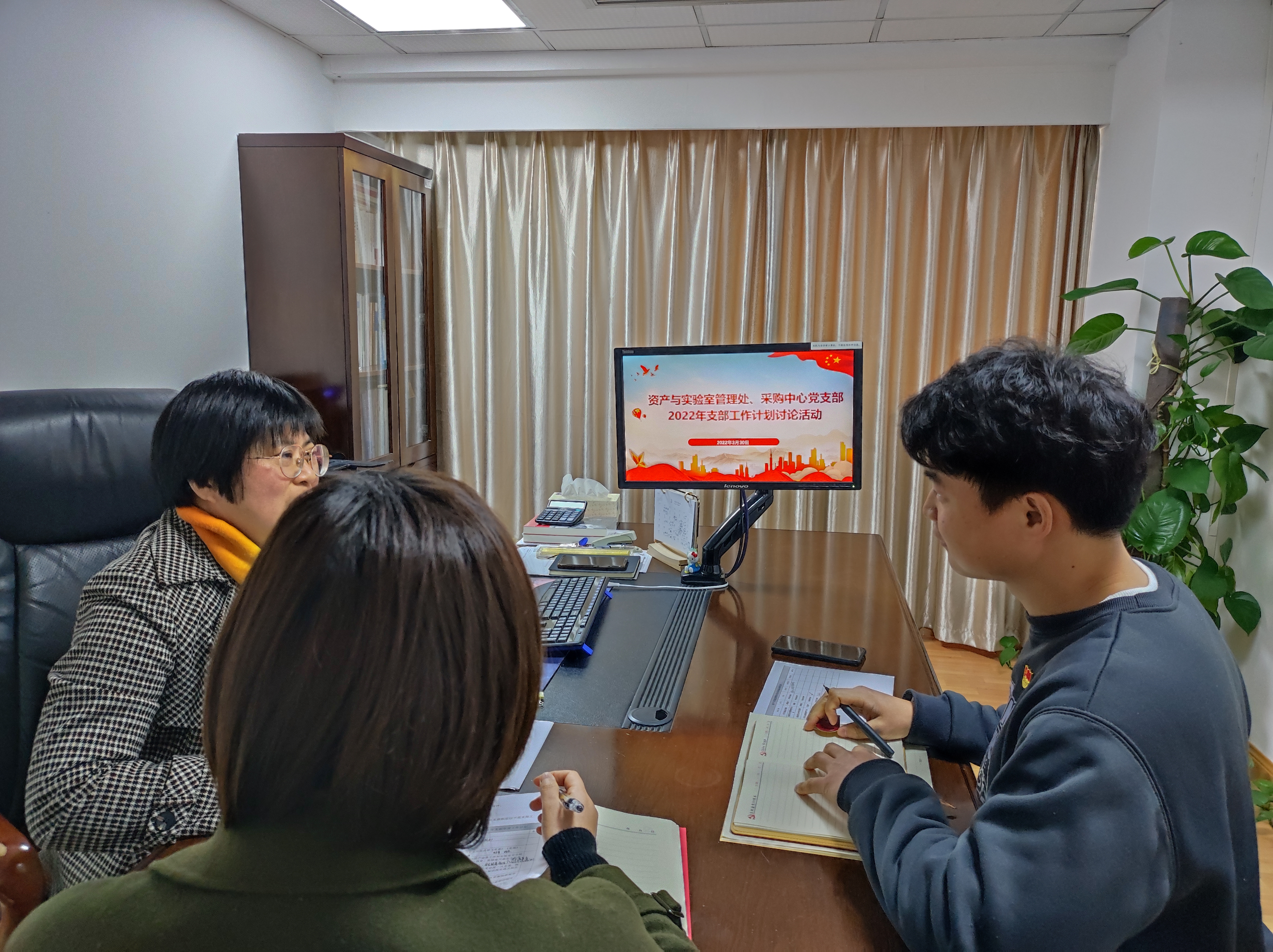 为做好支部2022年度党建各项工作,切实将党建工作落在党支部,强化党员政治建设、思想引领和行为示范,加强党支部工作与业务工作融合共进,促进党员教育与质量提升。3月30日,资产与实验室管理处、采购中心党支部组织开展2022年支部工作计划讨论活动,活动由支部书记姜英波主持。