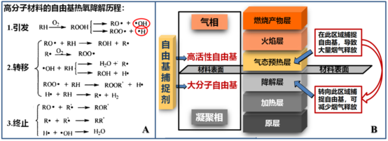 高分子材料自由基热降解历程(A)和“气相-凝聚相转移自由基捕捉”示意图(B).