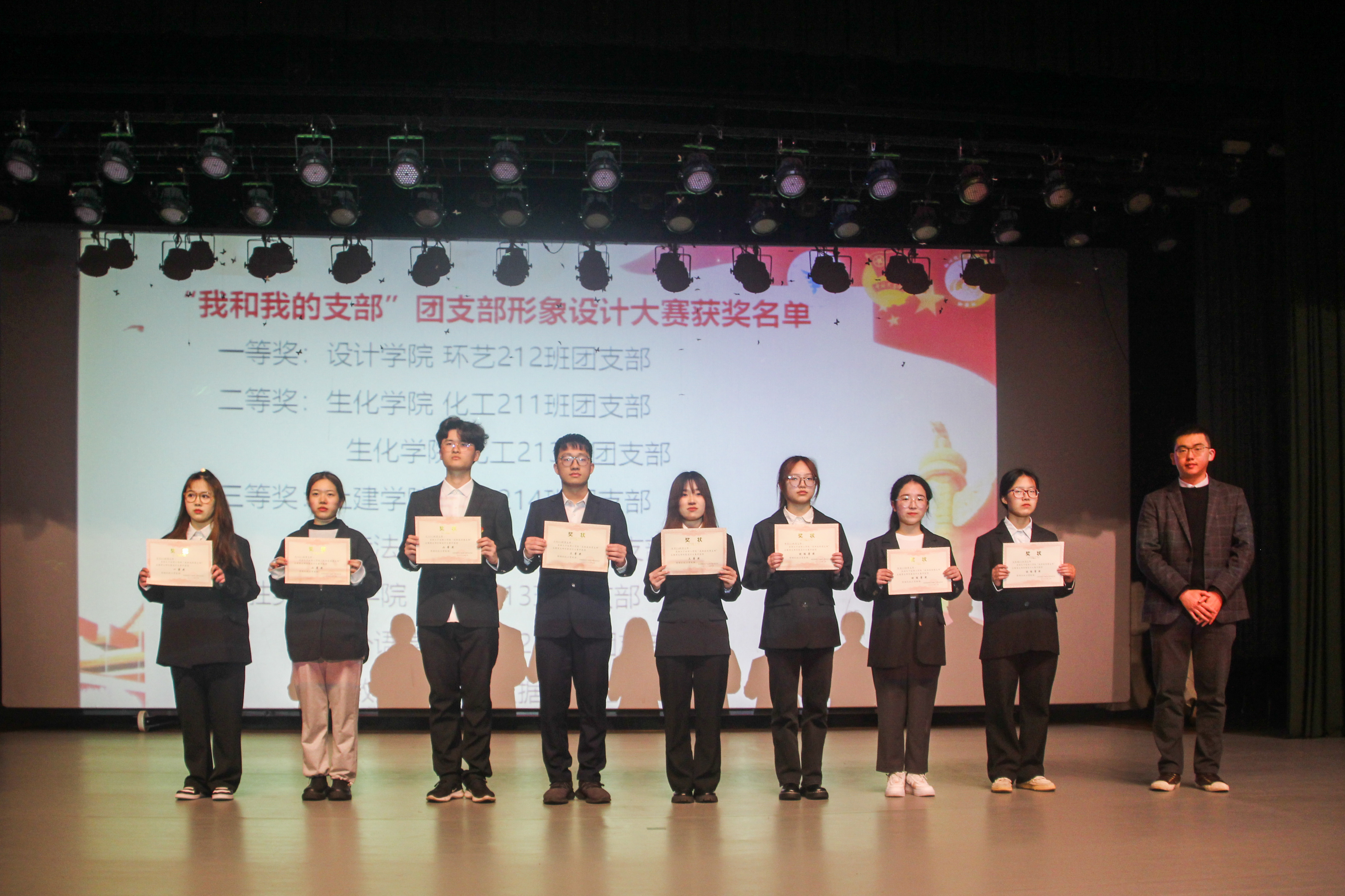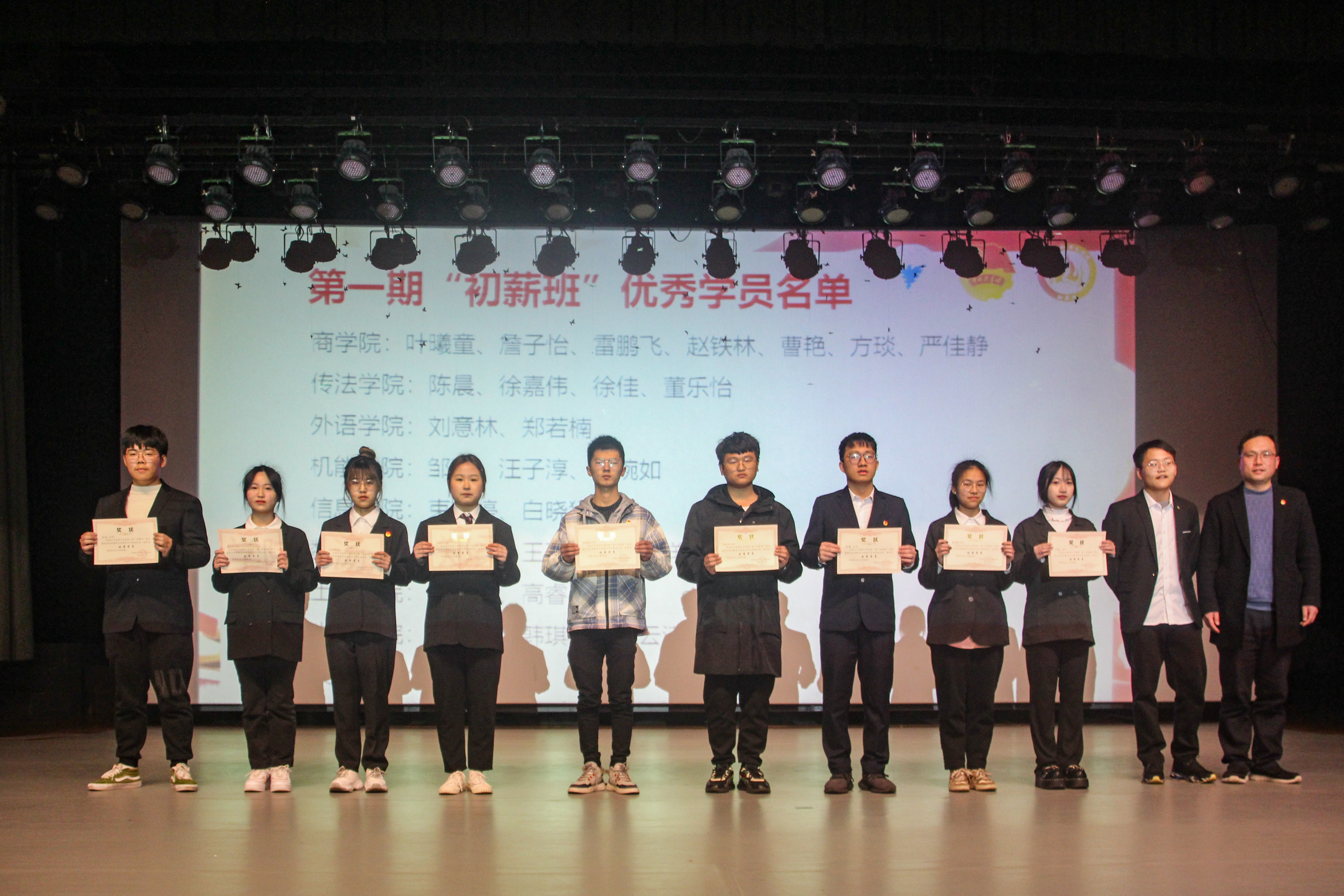 仪式在庄严的国歌声中拉开序幕。第一届“初薪班”新生团支委培训班自去年11月开班以来,5期课程、13节课、4000余小时学习总时长,“初薪”学员们开展了“党的十九届六中全会精神”“共青团史”等专题理论学习、进行了“基础团务”“语言表达”“摄像设计”“媒体宣传”等技能学习、完成了“主题团日活动策划”“团支部形象设计大赛”。其中,大数据202班团支部等6个团支部获得“我和我的支部”主题团日活动策划大赛一、二、三等奖;环艺212班团支部等8个团支部获“我和我的支部”团支部形象设计大赛一、二、三等奖和优胜奖,杨顺立为获奖团支部颁奖。陈艳宣读第一期“初薪班”团支委培训班结业名单,584名学员顺利结业,其中28名学员荣获第一届“初薪班”优秀学员荣誉称号。应中元为优秀学员代表颁奖。