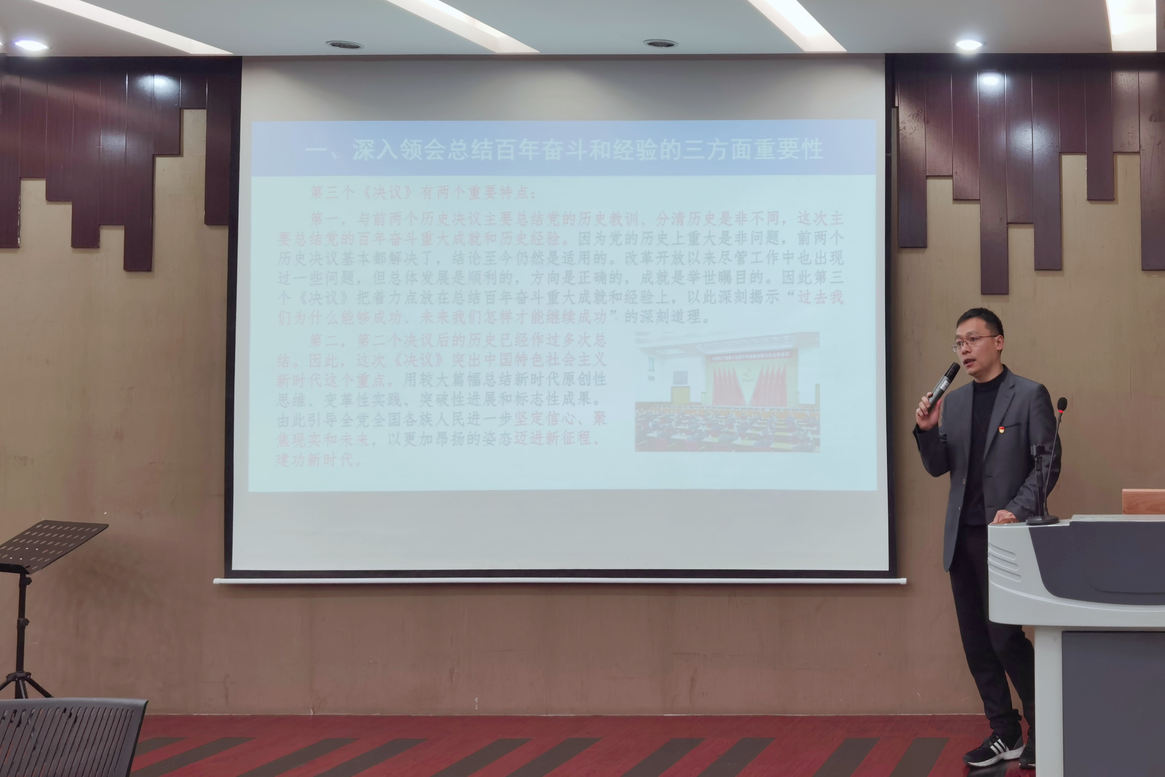 会上,陈恩从总结百年成就和经验的三方面重要性、中国共产党百年奋斗的四个重大成就、五大历史影响、十条历史经验以及“两个确立”重大深远的决定性意义五个方面对全会精神进行详细解读。
