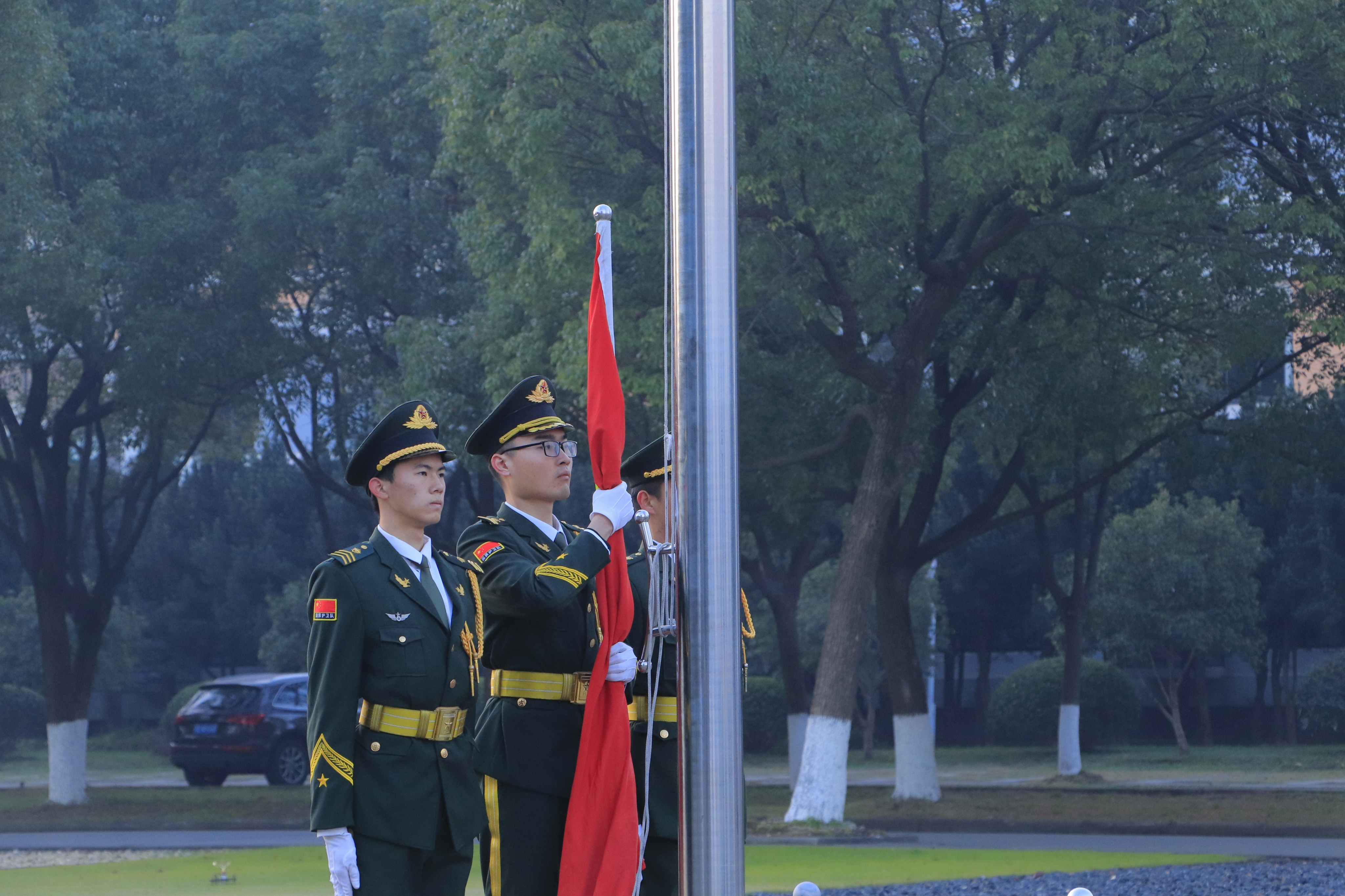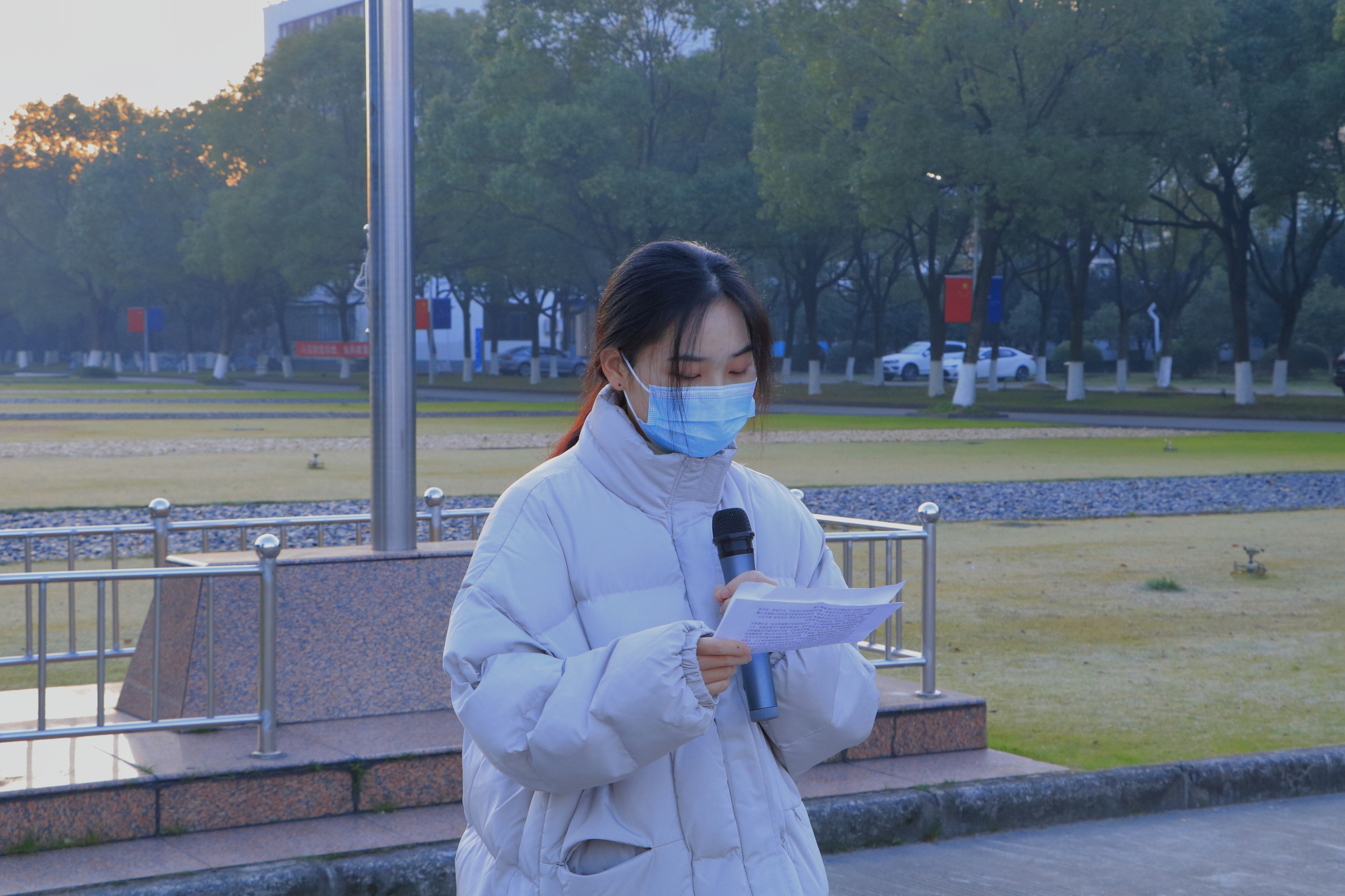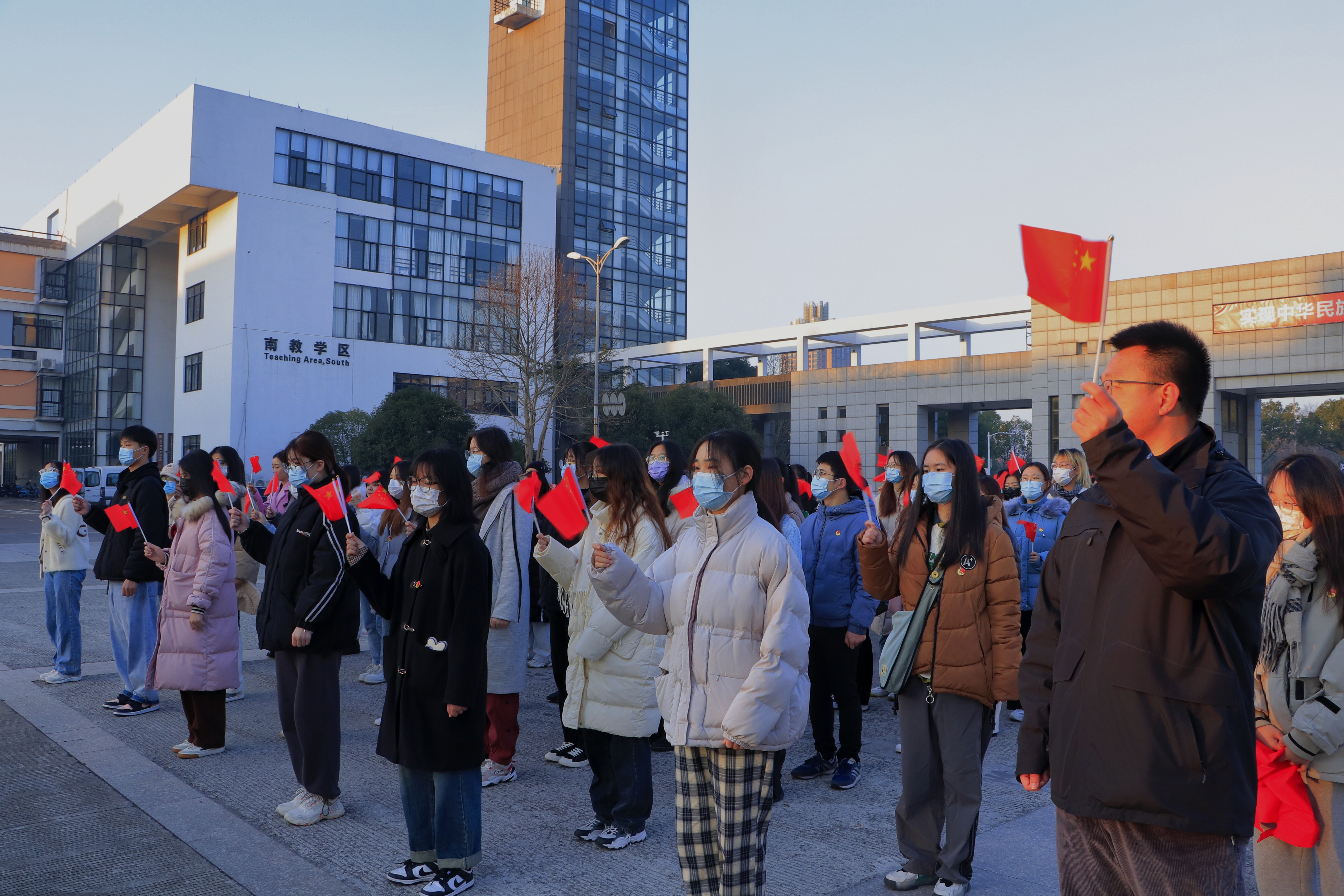 寒冬之下,暖阳初升。6时50分,学校国旗护卫队成员身着军装,踏着铿锵的脚步护卫着五星红旗入场。全体师生肃立,齐唱国歌,鲜艳的五星红旗随风飘扬,为本次仪式拉开序幕。
