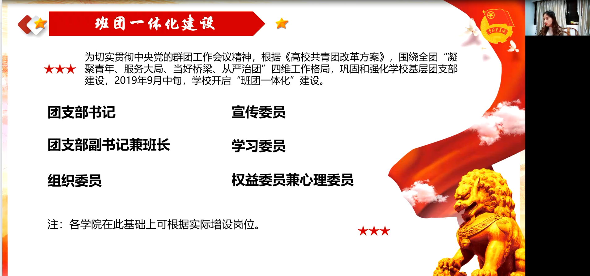 本次课程还设置了答疑环节,陈艳根据同学们提出的“如何提高支部成员共同参与活动的积极性”“如何确保团务工作有效开展”“如何提高青年大学习学习率”等问题和疑惑,进行详细解答,为同学们出谋划策,坚定了同学们排除万难的决心。课程的最后,陈艳祝愿每一位新生团支委成员都能在往后的工作中保持热爱,坚持梦想,快乐成长,自信发光。