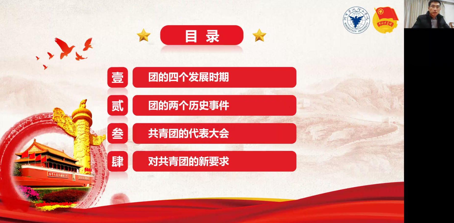 学校团委书记周春晓老师结合党的百年发展史,带来了《建党百年,回顾共青团的历史与发展》专题报告。他从团的四个发展时期代表事件入手,着重讲解了团的两个重大历史事件和团的历次代表大会。他强调,青年工作攸关党和国家前途命运,共青团是党的助手和后备军,新时代的共青团工作关键要抓牢“把培养社会主义建设者和接班人作为根本任务”“把巩固和扩大党执政的青年群众基础作为政治责任”“把围绕中心、服务大局作为工作主线”3个根本性问题,这就要求每一位团干部们提升个人能力,抓好基础团务,做好团建创新,在凝聚青年中扎实做好基层团组织建设。