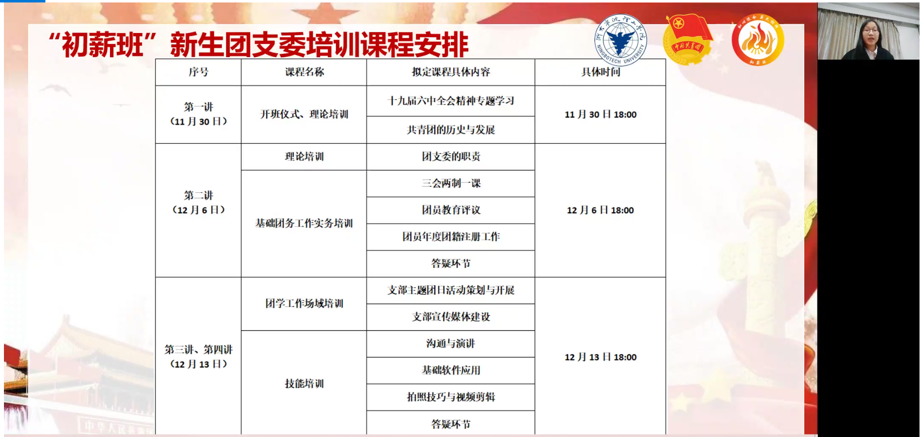 为深入学习宣传贯彻习近平新时代中国特色社会主义思想,特别是习近平总书记关于青年工作的重要思想,贯彻党的十九届六中全会精神,夯实共青团工作基础,加强新生团支部建设。11月30日18:00,学校团委启动第一期“初薪班”新生团支委培训计划,学校党委副书记冯建波、团委书记周春晓、团委业务副主管陈艳老师及新生团支委成员580余人参加线上开班仪式。