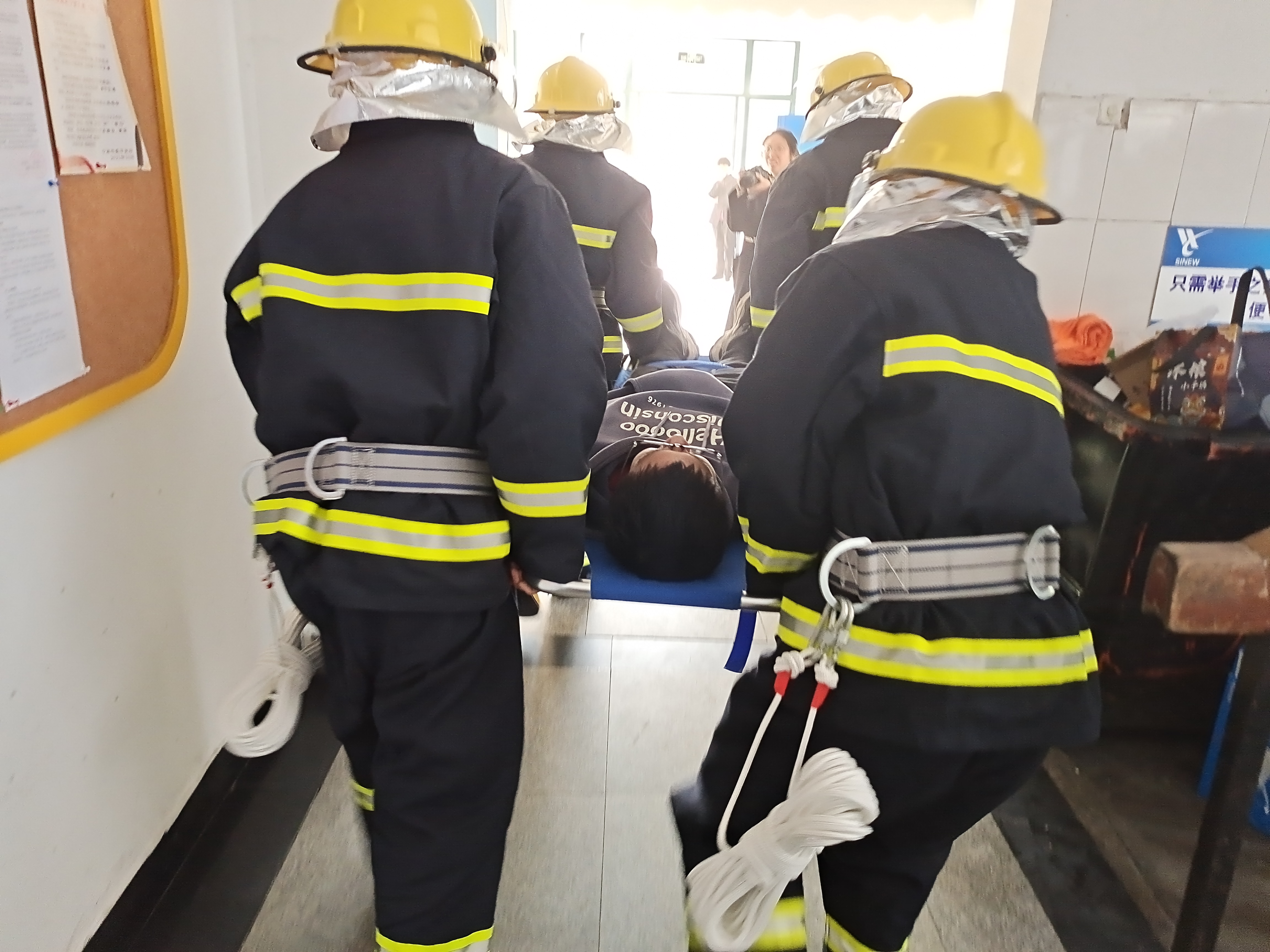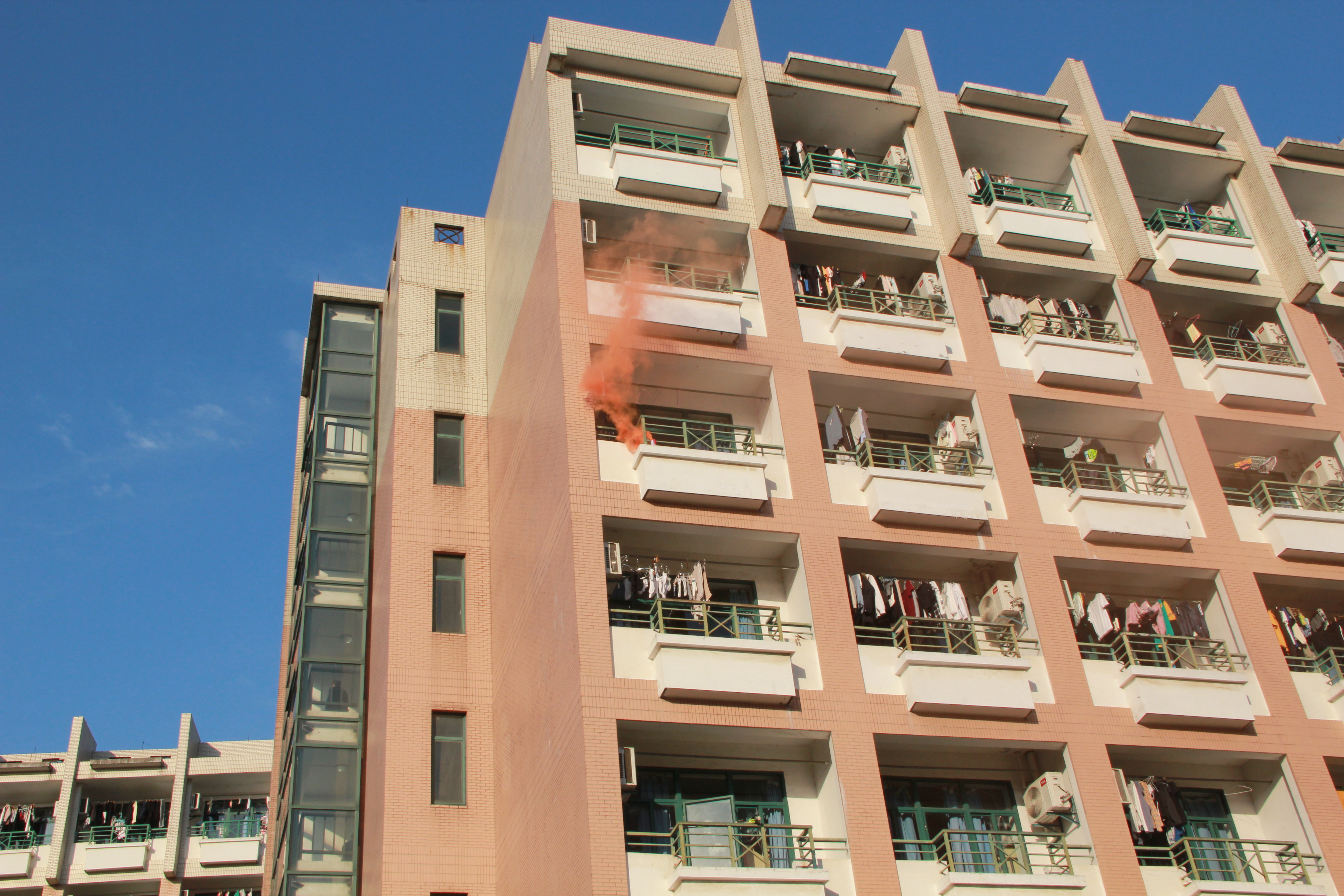 15时30分,演练开始,生活区三期15幢4楼男生宿舍发生火灾警情,随即报告学校安全保卫处,保卫处接到报告后立即拨打“119”电话报警,并派出6名志愿消防队人员着消防服、持消防器材进楼处置火情,同时,各宿舍学生在楼层引导员指挥下有序撤离宿舍并在就近集结点集合,以楼层为单位向各宿舍楼负责人报告人数情况,得知402宿舍有学生被困,随即派出2名志愿消防队人员进楼营救被困人员。