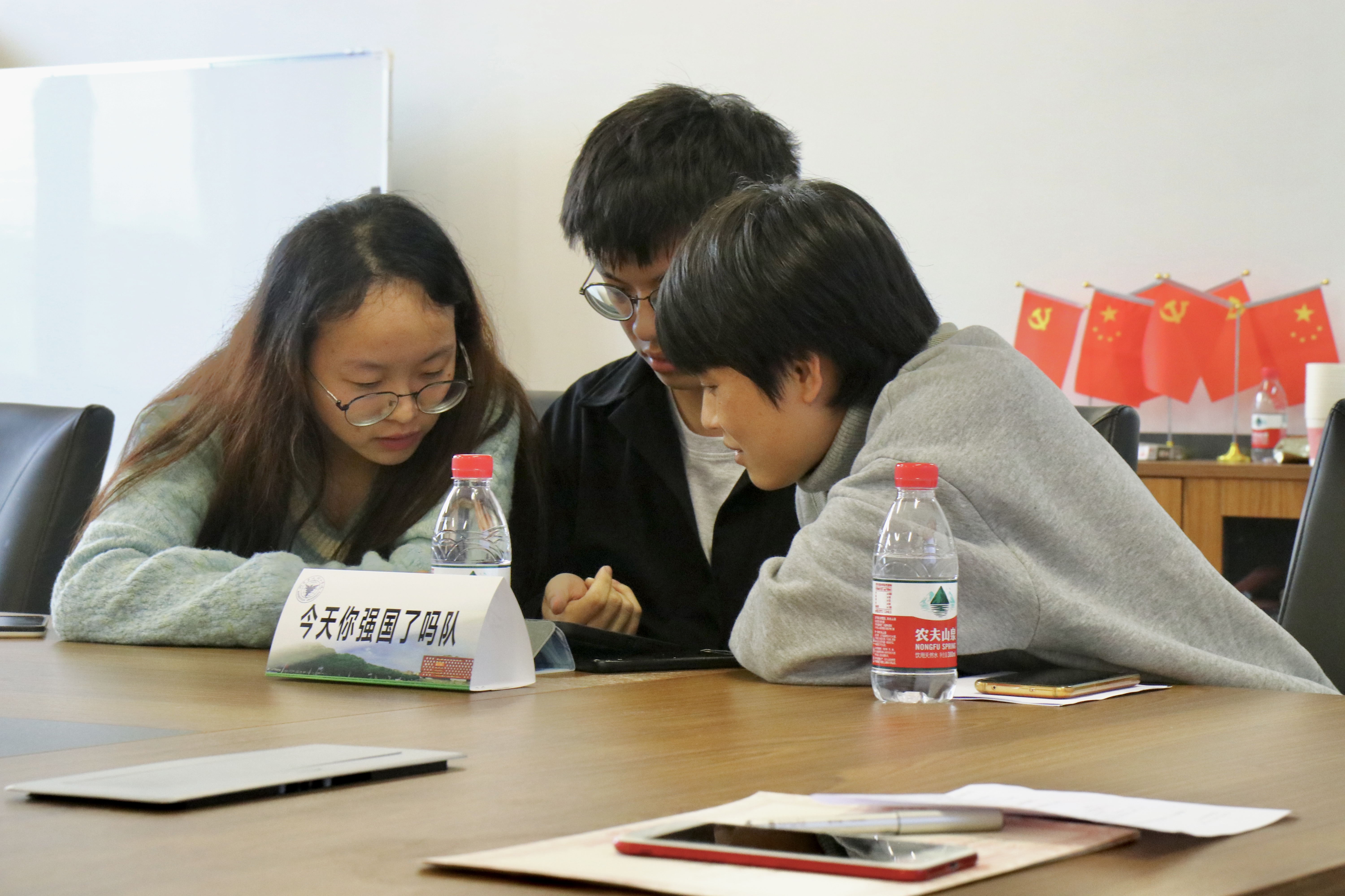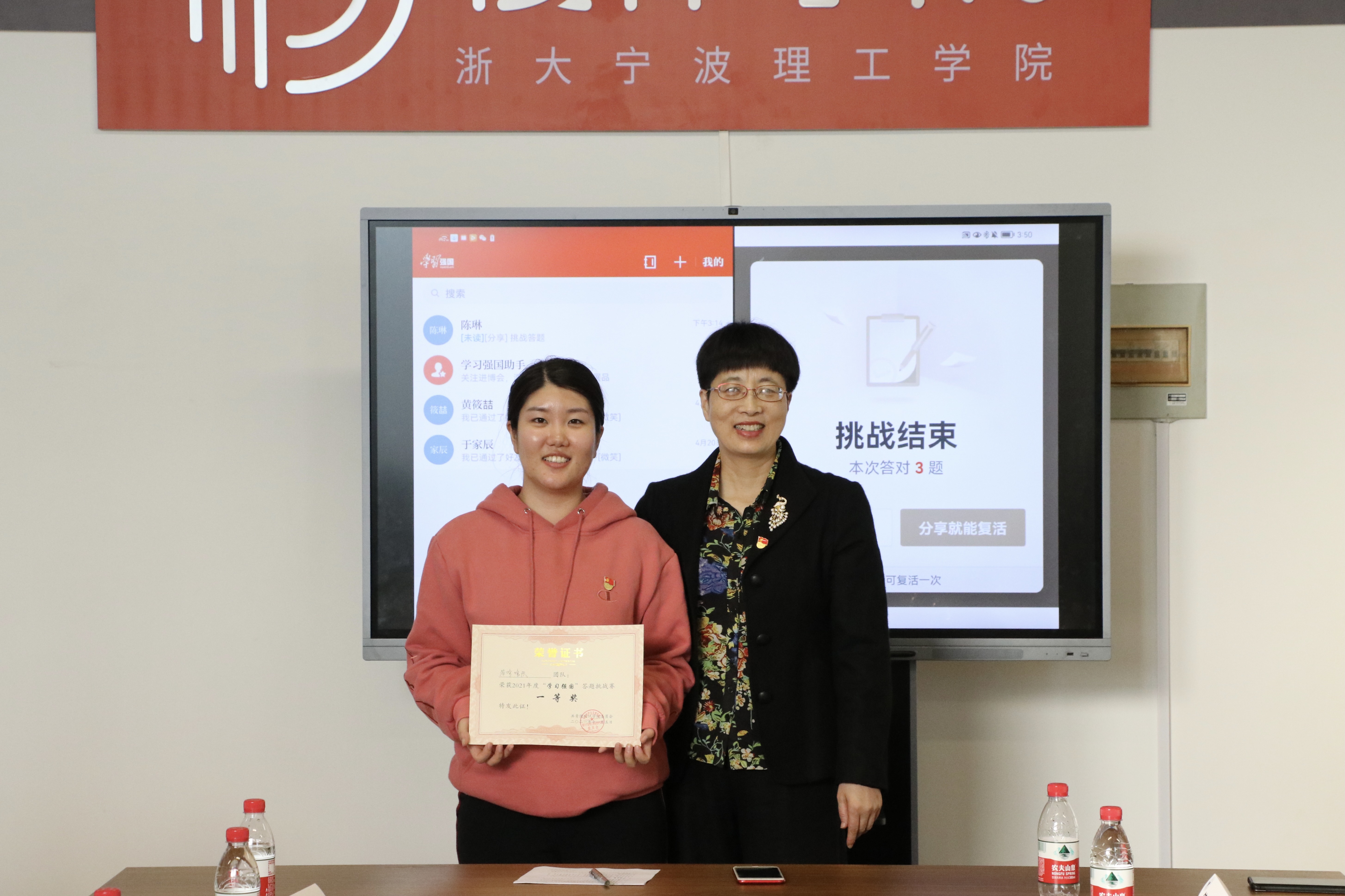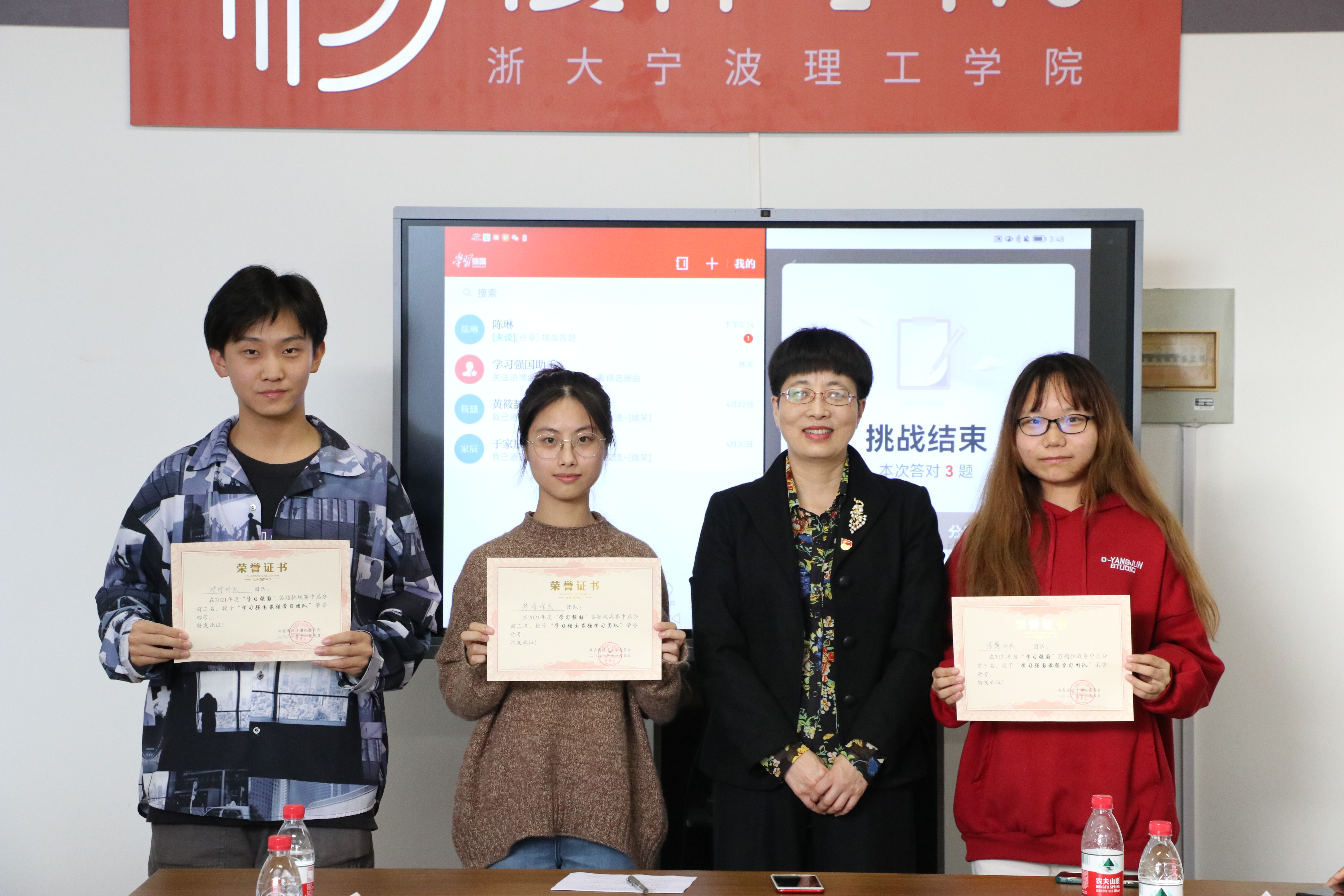 比赛设置团队一、二、三等奖和“学习强国最强学习者”以及“学习强国最强学习团队”两项荣誉称号。在裁判向大家讲解完比赛规则和参赛顺序后,参赛的师生党员有序作答,凭借自己丰富的知识储备奋勇答题,过五关、斩六将,一决高下,一旁观赛的老师与同学们屏息静气,聚精会神。经过激烈的三个答题环节后,沈鸿杰同学、刘新月同学和陈奕阳同学获得了设计学院2021年度“学习强国最强学习者”的荣誉称号,由高雅姝老师、刘新月同学和吴素珍同学组成的“答啥啥队”获得了设计学院2021年度“学习强国”答题挑战赛团队一等奖。吴春书记为获奖团体和个人颁奖。