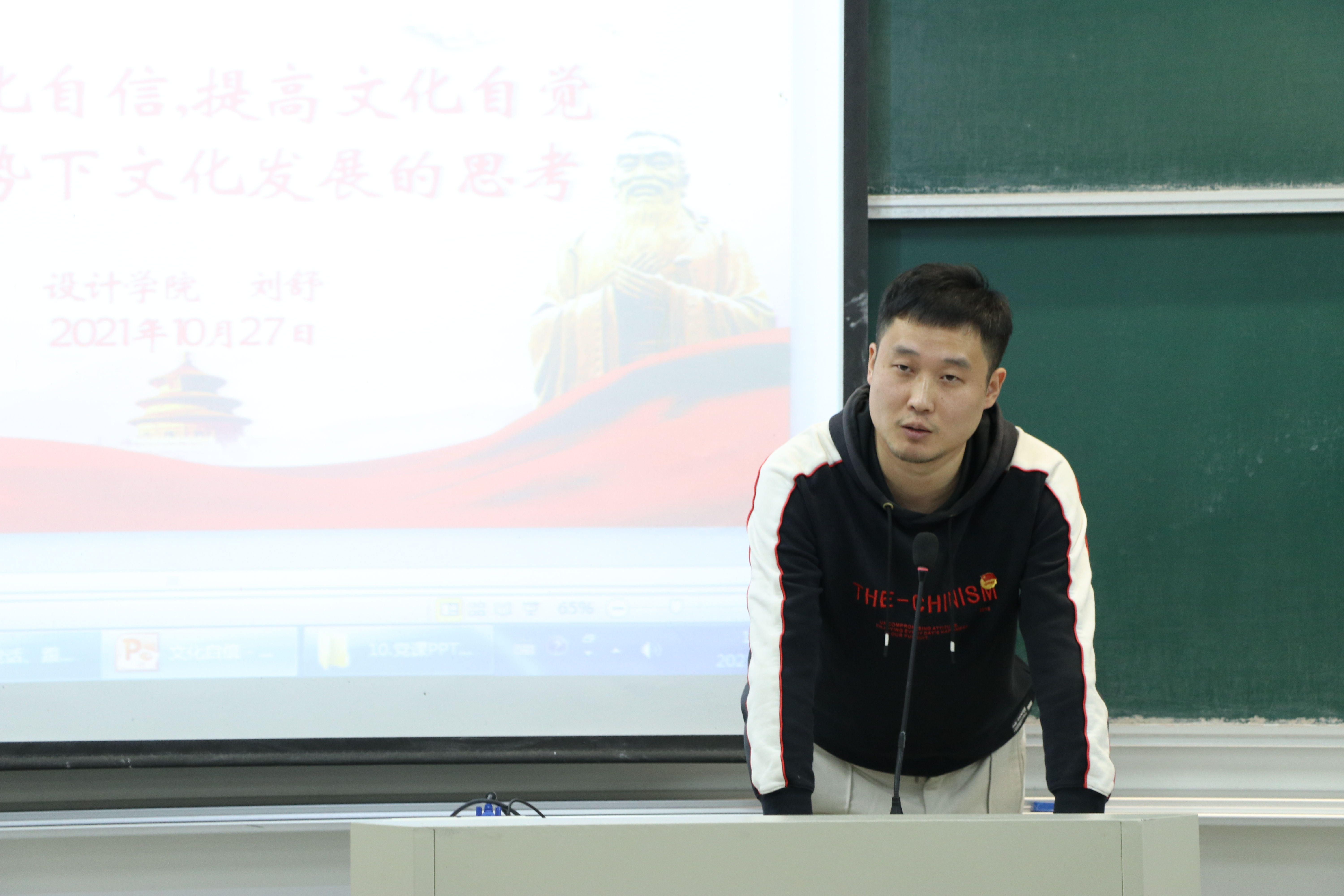 建筑学学生党支部书记刘舒老师以“增强文化自信,提高文化自觉”为主题,与学生党员们深入探讨了文化自信的底气来源与文化自信的重要意义,他希望学生党员们要提升文化软实力,包容借鉴外来文化的精妙之处,弘扬发展中华文化所具有的独特魅力,立足国本又面向世界,以此来提高我国文化“走出去”的能力。