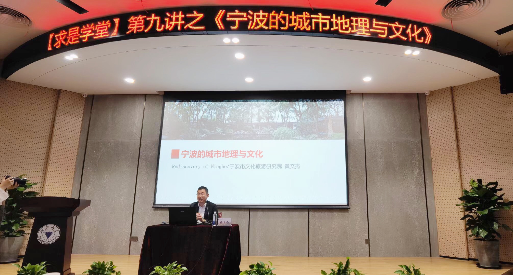 在开场短剧的沉浸式体验之后,现场师生对于四知精神有了非常直观的体验与认知。为促进学生进一步了解孕育宁波四知精神的文化土壤与历史逻辑,现场特别邀请到了宁波市文化旅游研究院副书记、宁波文化研究会副会长黄文杰老师,为大家带来《宁波的城市地理与文化》的主题讲座,该讲座是学校【求是学堂】系列讲座的第九讲。