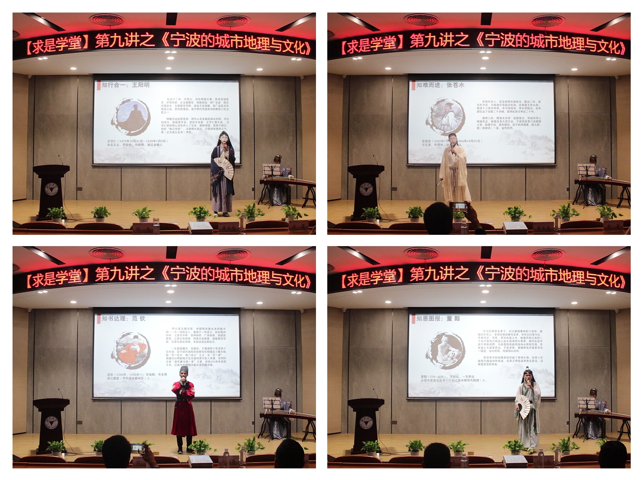 灯光暗淡,琴声悠扬,在全场师生的凝神屏息之中,王阳明、张苍水、范钦、董黯四位“宁波圣贤”依次登场,他们宽袍大袖,神色泰然,或与学子们坐而论道,畅论“知之明觉精察处即是行,行到真切笃实处就是知”的知行合一之道;或慷慨悲歌,一句“生比鸿毛犹负国,死留碧血欲支天”,尽显知难而进的英雄气概;或广发天一阁落成邀请函,书香宁波的知书达礼跃然纸上…… “四知”精神的历史人物生动地演绎,瞬间把现场师生拉回到那璀璨的历史时空;更巧妙的是,每一位古代宁波圣贤“见过诸生”之后,现场大屏幕中又跳出信息学院优秀校友代表的视频寄语,他们以自己毕业、就业、创业、矢志学业等生动的人生实践,为现场的学子们诠释了“四知精神”的时代内涵,使现场同学们身临其境,大受感动。最后,在四位扮演者的领读下,全场师生齐声朗读《中天阁勉诸生》,“为学之道,不可一日曝之,十日寒之……”文字的思想力量与声音的青春涌动交织在一起,在最大程度上拉近了同学们和“四知”精神的亲密距离。