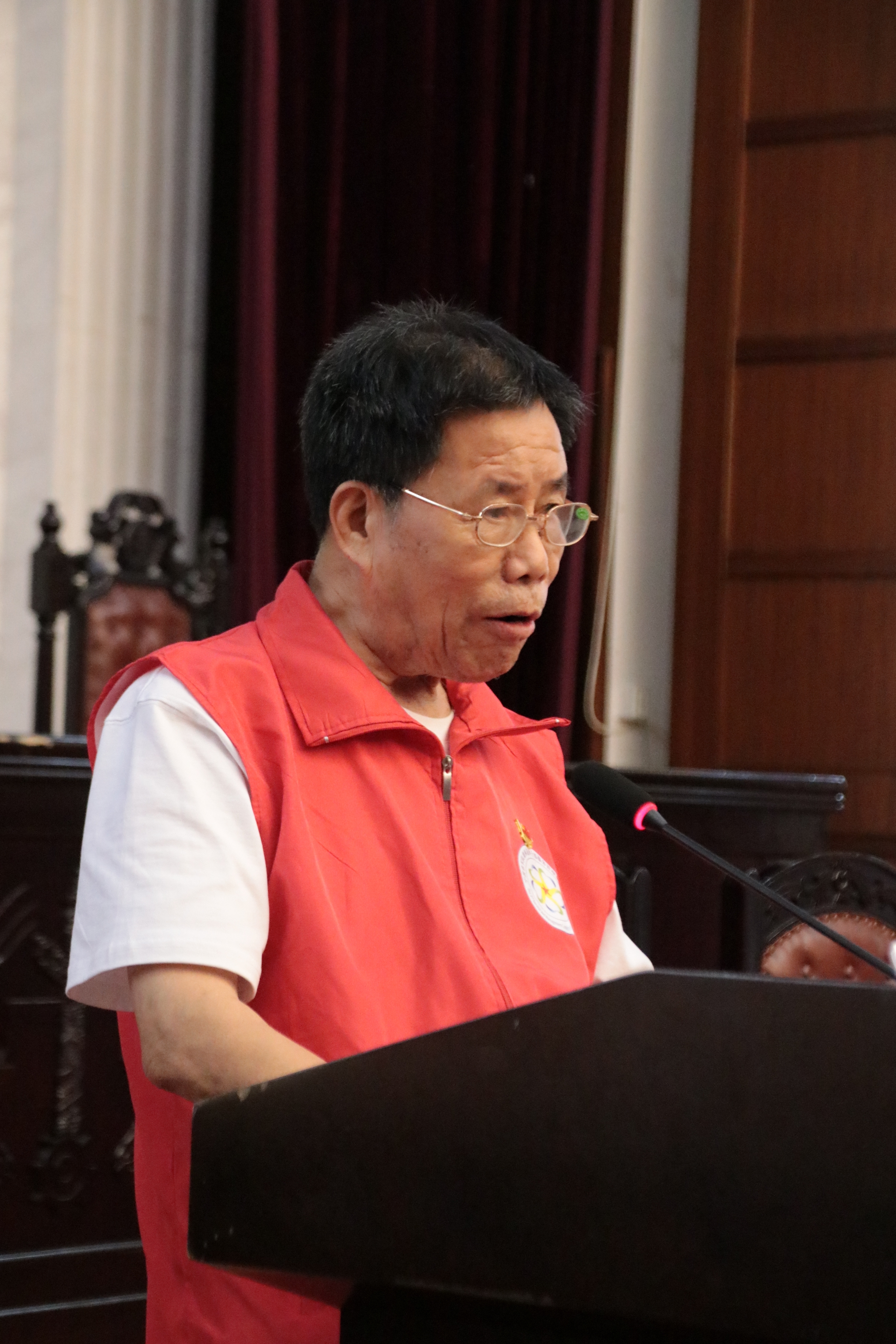 黄学祚同志则向大家讲述了抗美援朝时期风餐露宿的艰苦军旅生活以及一幕幕扣人心弦的战场故事。他提到,参军多年来,他目睹了许多英烈为党为人民冲锋陷阵、无私奉献的场面,我们今天的幸福生活,是与革命先烈的付出密不可分的。最后,黄学祚同志向大家表达了自己的美好祝愿,希望大家时刻保持共产党人的信仰,努力奋斗,成为国家栋梁。黄学祚同志今年86岁,16岁未到入伍年纪却冲破壁垒参军为国,黄老坚持站着演讲,他的不怕吃苦、不怕流血、不怕牺牲的精神震撼了在座的所有人。
