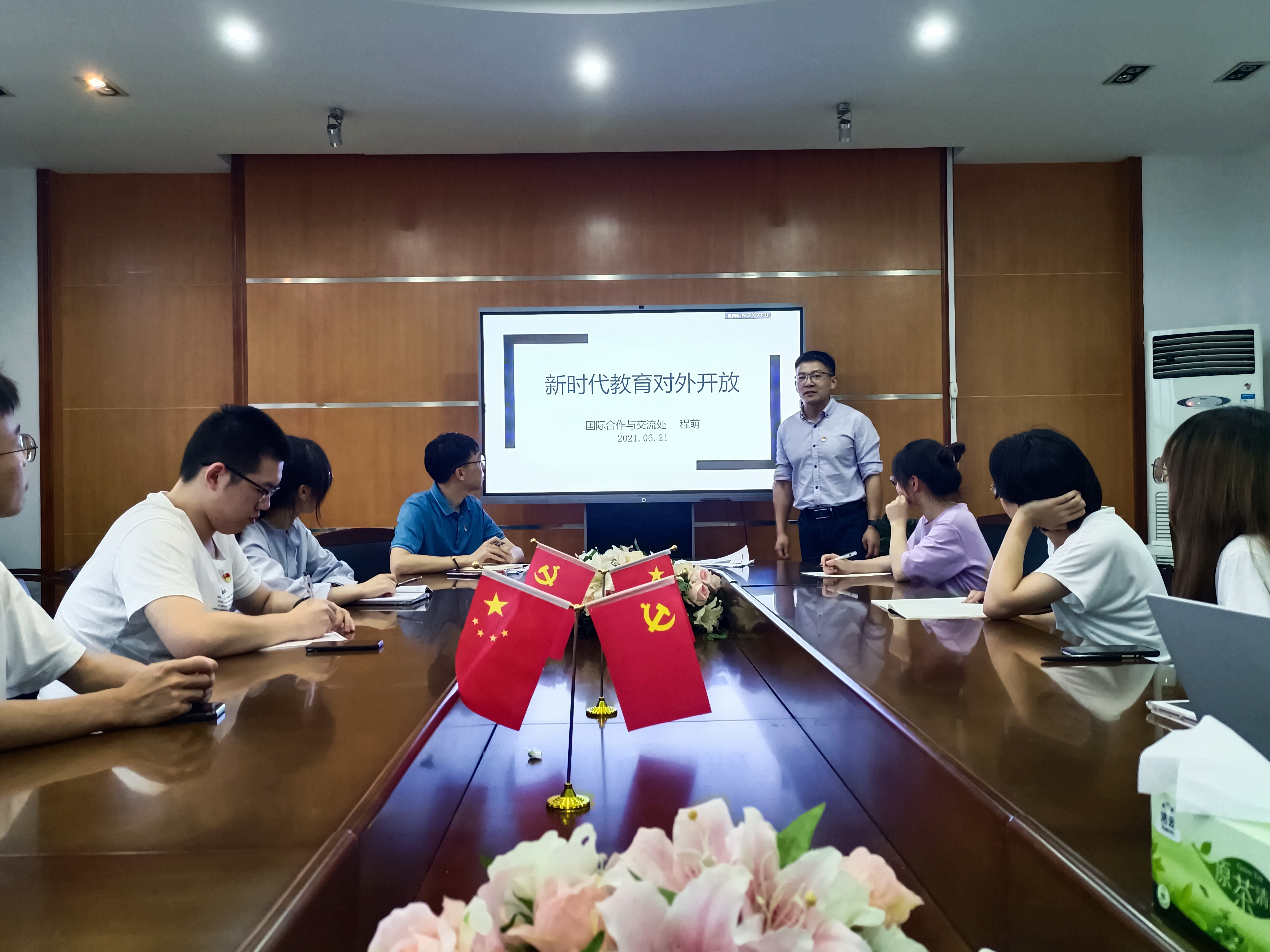 2021年6月21日晚,学生国贸专业党支部召开党史学习教育主题党课,国际合作与交流处副处长程萌老师为支部学生讲党课。