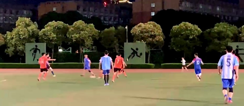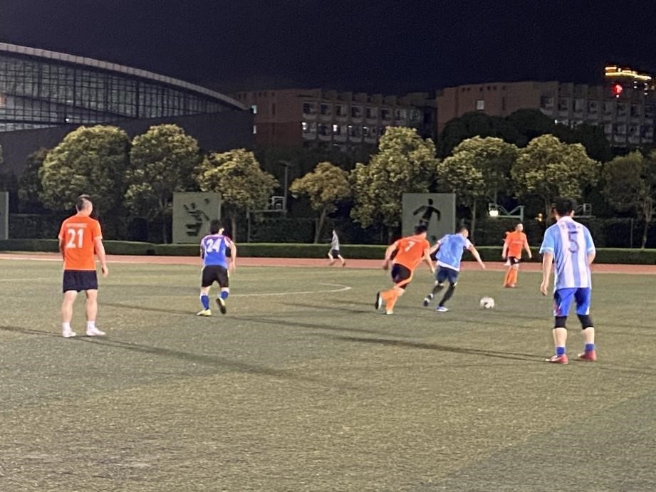 华灯初上,阵阵微风中,开赛哨声响彻操场。比赛开场,橙队攻势猛烈,前锋线在短短五分钟内多次制造射门机会,蓝队门口一时风声鹤唳。顶住橙队前十分钟的迅猛攻势后,蓝队渐渐掌控中场,并多次冲击对方边后卫身后的空间。比赛第15分钟,蓝队前锋高能老师接赵明达老师远距离妙传高速插上,右脚连停带过,一记巧射攻破橙队大门,打破僵局。中场短暂休息后,橙队加强了战术布置逐渐重新掌握主动。比赛进行至35分钟,橙队胡鹿鸣老师左侧内切,一脚远射打进球门右下角,正当全队庆祝时,裁判却吹罚越位在先,进球无效。