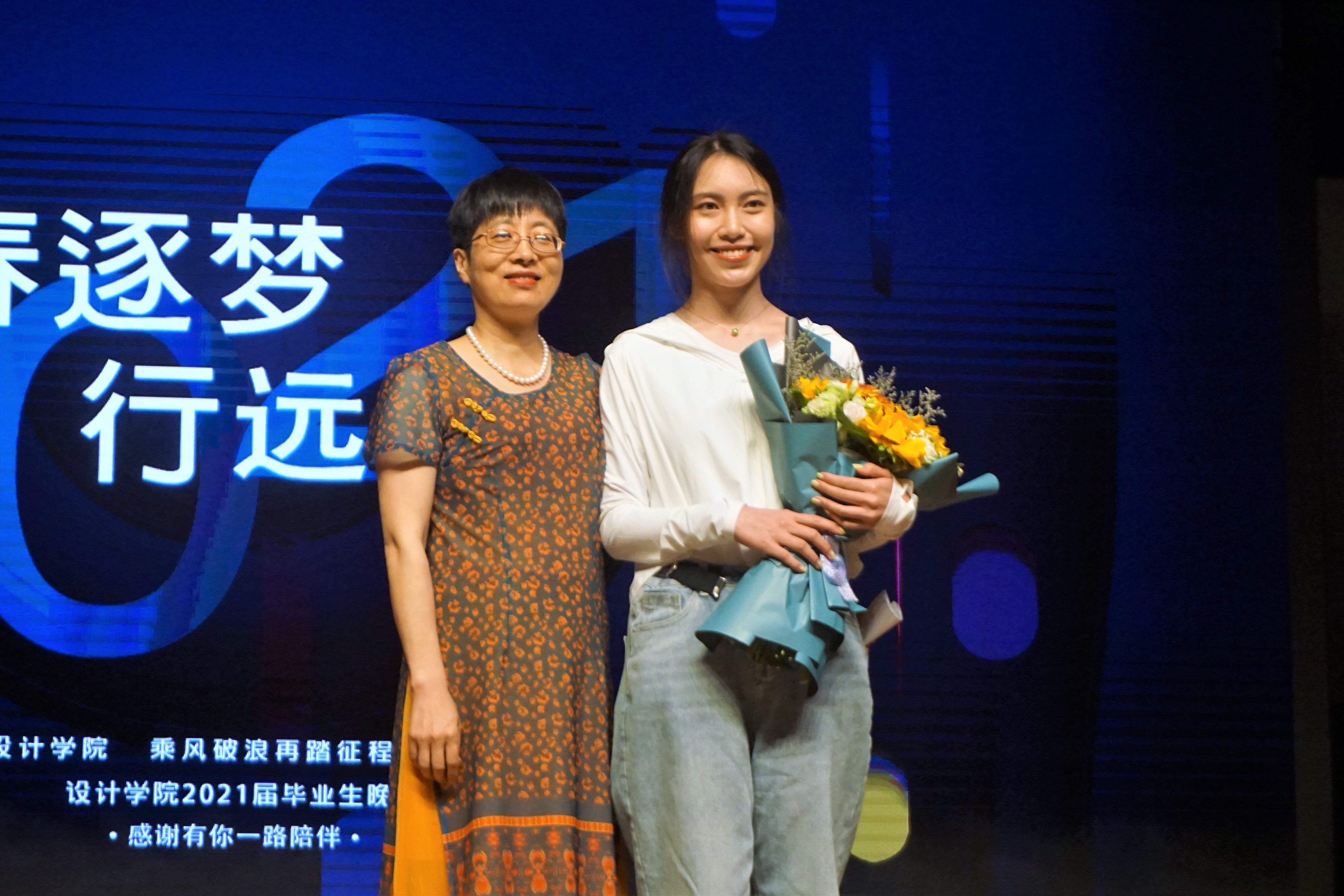 吴春发表毕业生致辞,并为2021届毕业生代表王雪雯同学献上鲜花和祝福。她指出,本次晚会是设计学院成立以来举办的第一台毕业生晚会,也是所有设计师生对毕业生的祝福晚会。今年是学校建校20周年,浙大宁波理工学院是我们共同的家园,无论各位将来身处何方,她都会像母亲一样永远关心、关注着大家,设计学院也始终是大家坚强的后盾。同时也希望同学们能够行远思恩,常回家看看,努力为母校的发展添砖加瓦、献计献策。