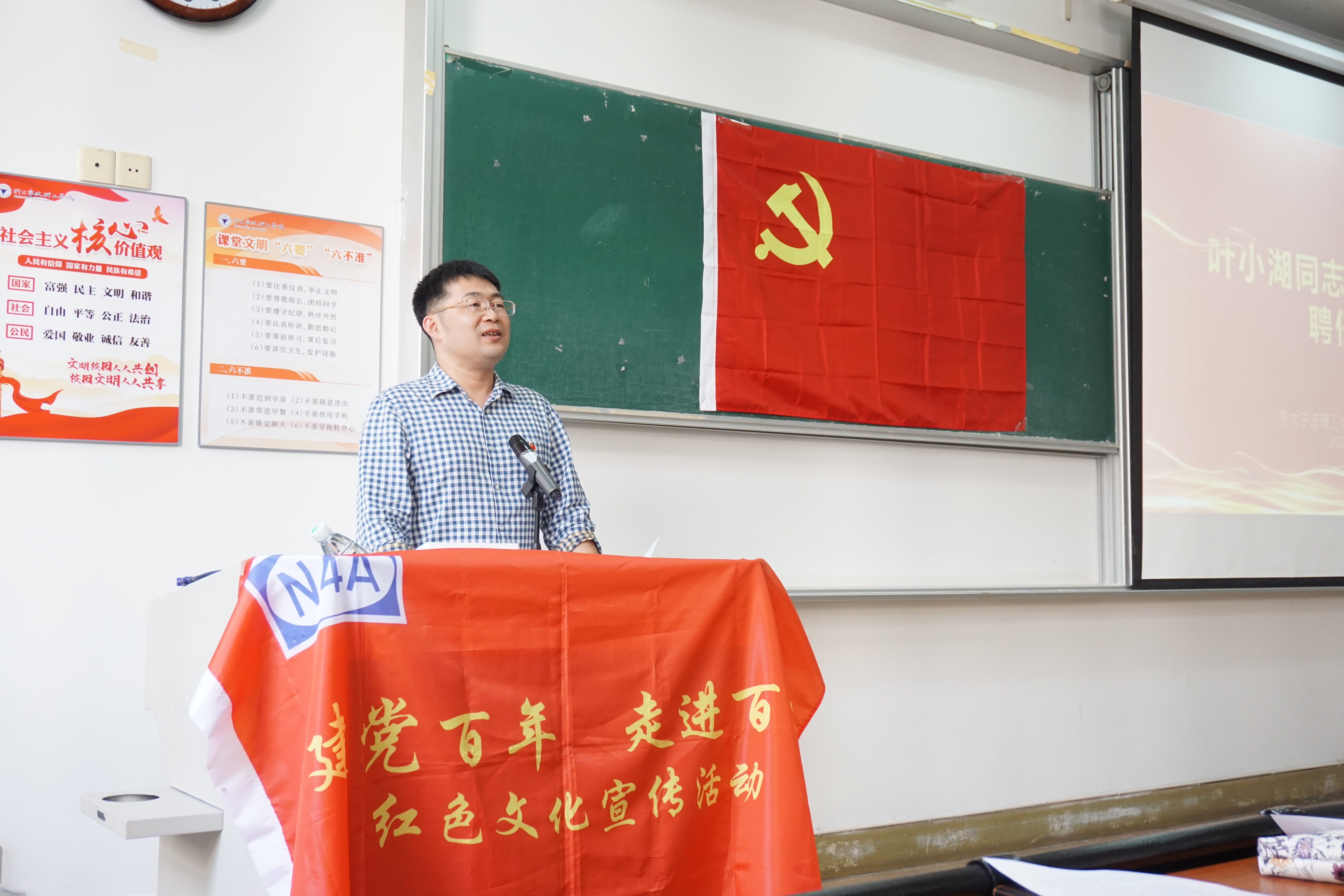 适逢中国共产党成立100周年,为深入扎实开展党史学习教育,传承红色基因,加强我院思政队伍建设,5月25日下午,传媒与法学院党委在SC204举办了“红色讲坛”第五讲暨叶小湖同志兼职思政导师聘任仪式,参加此次活动的有学院党委副书记(主持工作)、副院长朱小红,学院党委副书记、纪委书记胡鹿鸣,全体思政辅导员和在校学生党员、入党积极分子,活动由学院党委组织委员、法学学生党支部书记赵红主持。
