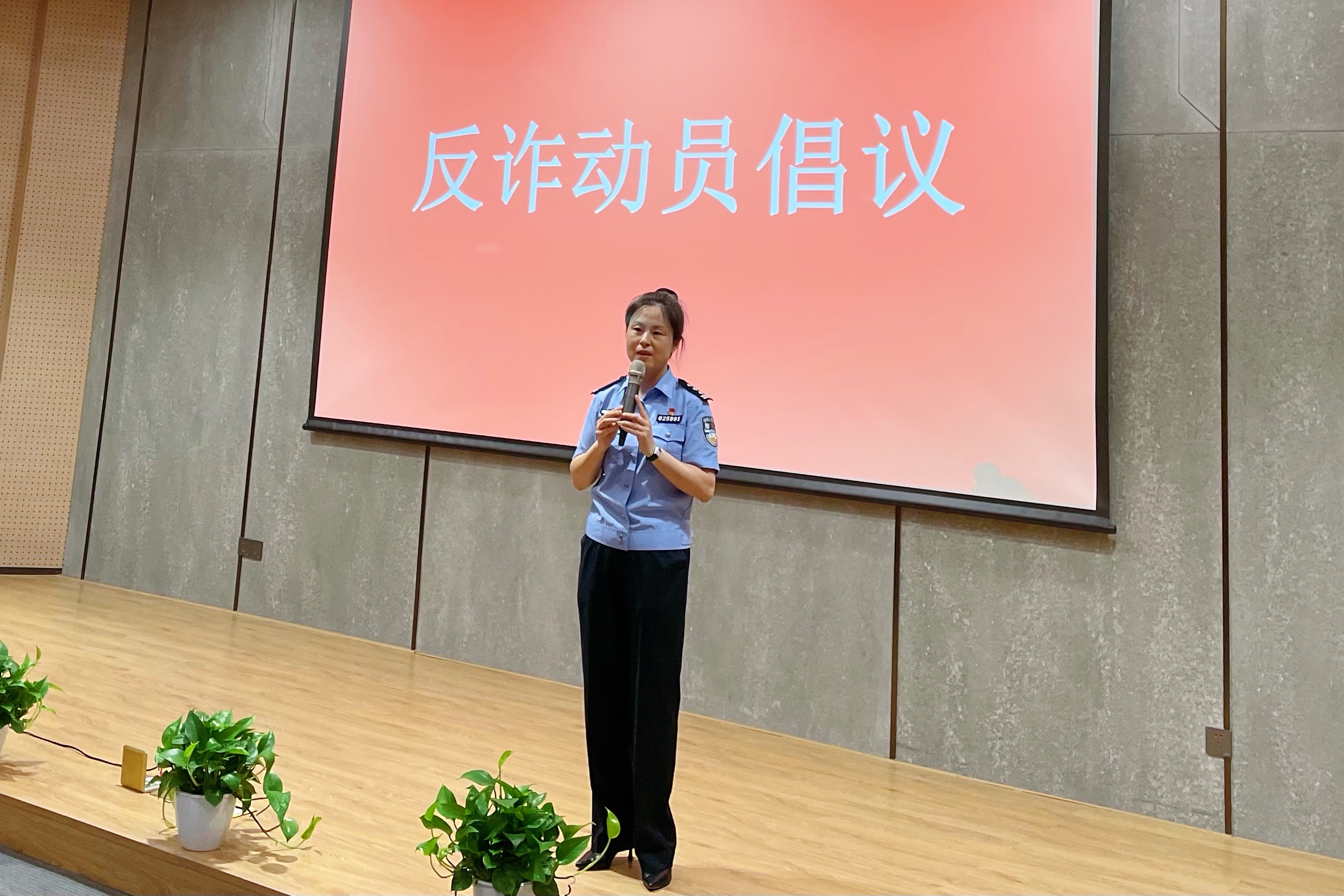 文华派出所所长虞景锦向安全员们提出反诈动员倡议。她以“校园里的反诈横幅学生是否喜欢”、“文华派出所的电话是否在大家手机通讯录中”以及“大家是否安装了国家反诈中心APP”三个问题开场,表明目前大学生反诈骗意识薄弱的现状,并通过列举近期南高校园区发生的多起电信诈骗案件强调了当前诈骗案件的高发。她表示,被诈骗和协助诈骗不仅对金钱财物有损失,还会对个人以后的征信记录、就业求职产生影响。安全员作为学生中的班级代表要积极配合并做好班级的反诈骗宣传工作,提高班级同学的反诈意识,切实维护同学的财产安全。