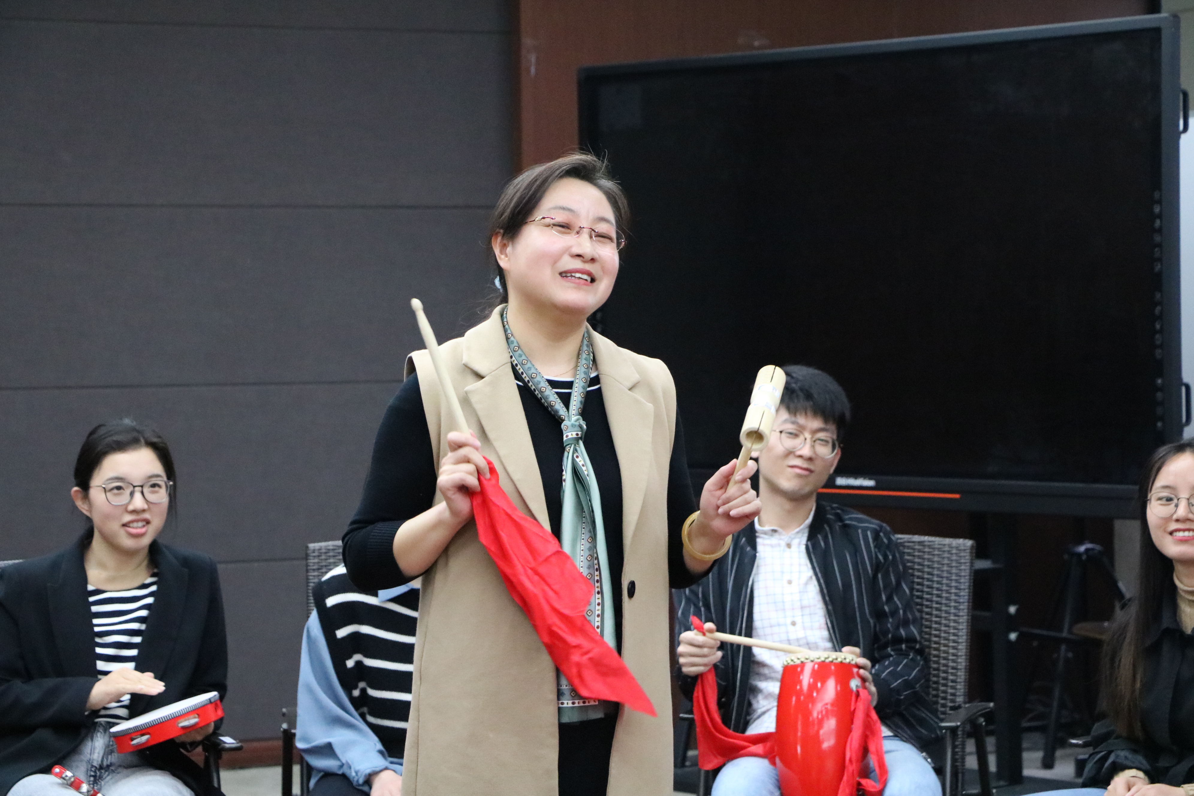 活动现场,老师们围坐一圈,手上拿着各自挑选的乐器作为对话工具。首先由朱小红老师进行示范,运用手势和语言变换进行引导,各位老师跟随朱小红的节奏时而击打乐器,非常具有默契的时而击打、时而停止、时而鼓声齐鸣,气氛热烈。互动环节中各位老师轮流上台,运用不同的方式引导,变换大家手中乐器的节奏,活动现场不时地爆发出欢快的笑声。最后参加团辅的老师们敞开心扉谈了自己的感受。大家都表示通过“鼓圈”紧绷的心情得到了舒缓,急切澎湃的鼓声宣泄出了自己长时间高强度工作的心理压力和负能量,得到了有效的减压。朱小红总结发言时,结合自己的工作经验,给各位老师们分享了自己的工作心得。她表示,无论我们的工作压力有多大,面对的困难有多少,我始终相信办法一定比困难多,一定要保持初心,坚持原则,言行一致。