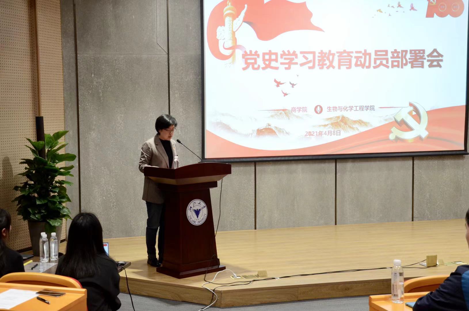 4月8日下午,商学院、生物与化学工程学院在启新大讲堂联合召开党史学习教育动员部署会。商学院党委书记兼副院长李萍萍,党委副书记、纪委书记周丽娟,各党支部委员、第四十期入党积极分子参加动员部署会;生化学院党委副书记(主持工作)兼副院长楼文军,全体学生党员、第14期重点发展对象参加会议。马克思主义学院副教授吴新林受邀做党史学习教育专题党课。楼文军主持动员部署会。