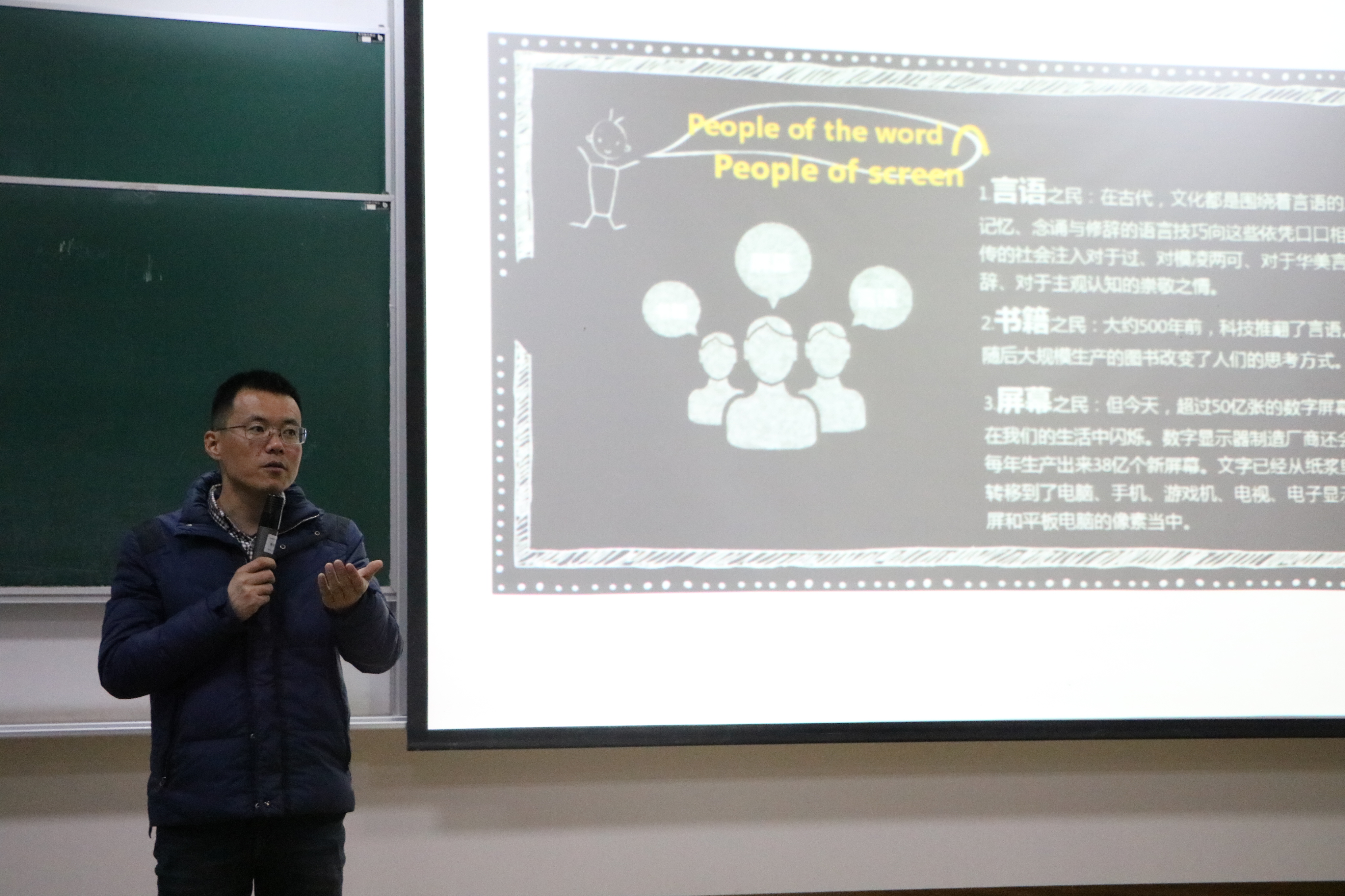 讲座从“历史视野下书与阅读的形态变迁”,“一个图书馆员的阅读史与阅读观”,“传法学院阅读力分析——图书馆的视角”,“在甬学生的‘四知精神’书单荐读”四个角度展开论述。刘杰围绕“书是什么”、“书的定义”、“读是什么”、“屏读与纸读的区别”、“人类为什么要阅读”等问题展开,对阅读形态的变化做系统讲述。同时,刘杰用生动诙谐语言分享自身读书经历、读书经验与阅读观,并用数据展示了阅读与传媒与法学院以及每个学生个体的渊源。此次讲座让同学们更清楚,更系统地了解了阅读的发展历程,不同的阅读方式带来的影响,以及阅读的重要性,可谓是受益颇丰。