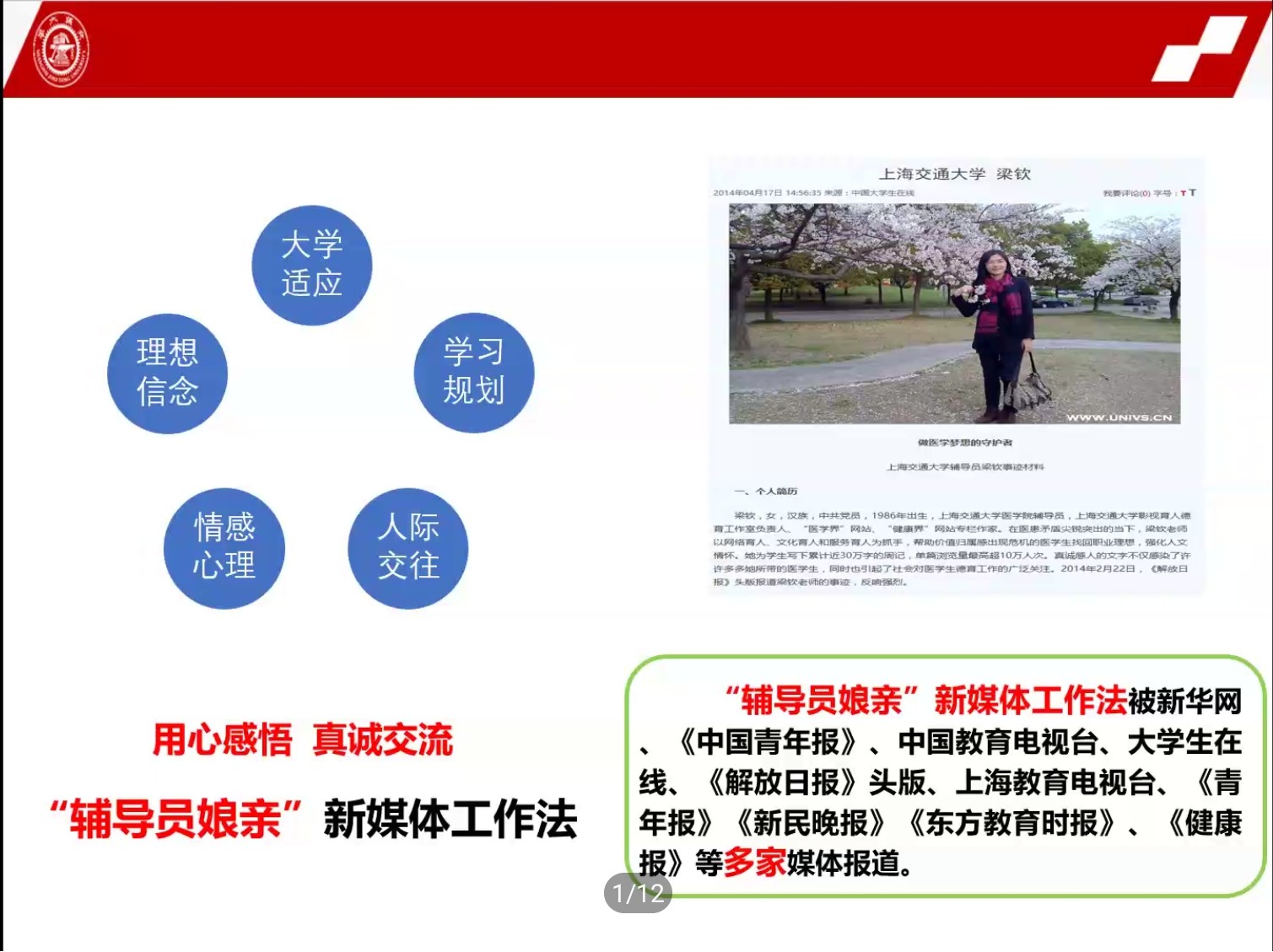 思政教育是立德树人的灵魂工程,网络思想政治教育是互联网与思政教育的深度融合,运用新媒体技术是以学生喜闻乐见的方式增强思政教育时代感和吸引力的重要方式。为进一步提升辅导员网络育人技能和成效,12月29日上午,学生工作部特邀上海交通大学思政教师、硕士生导师梁钦为全体辅导员做《用心感悟,真诚交流——辅导员新媒体工作谈》网络专题直播。