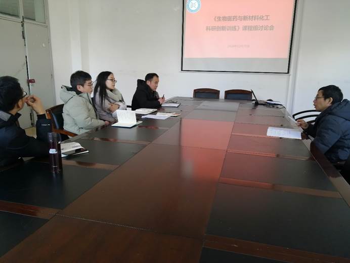 2020年12月25日下午,在生化学院ND103会议室,《生物医药与新材料化工科研创新训练》课程组教师相聚一堂,召开课程组教学研讨会,对接工程认证,探讨教学大纲,深化课程改革。