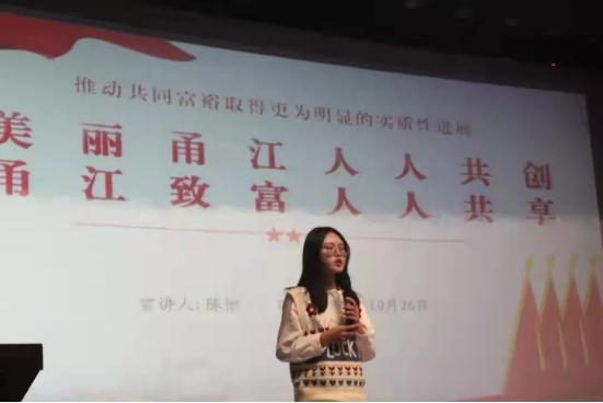 陈怡同学还担任了“大美湾底,薪火甬江”共同富裕实践团负责人。她带领团队成员前往宁波市鄞州区下应街道湾底村、姜山镇甬江村调研共同富裕密码,并撰写调研报告。陈怡将调研成果融入“浅谈家乡变化、什么是共同富裕、姜山镇甬江村致富路、青年学子当如何”四个部分,为浙大宁理学子带来八场宣讲,认真阐述了共同富裕的含义与意义。