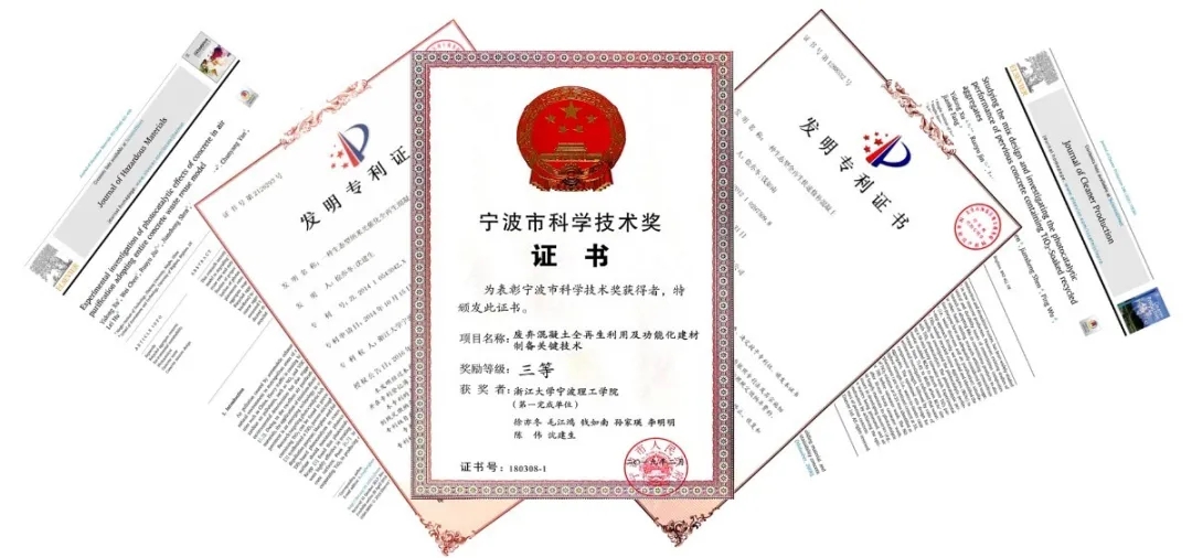 上述成果在TOP期刊发表论文2篇、出版英文专著1部、授权发明专利4项(均排名第一),《废弃混凝土循环再生及其在道路工程中的应用》获浙江省高校优秀科研成果奖三等奖、《废弃混凝土全再生利用及功能化建材制备关键技术》获宁波市科技进步三等奖、《植生型透水沥青混合料制备关键技术》获中国建材与家居行业科技进步二等奖。