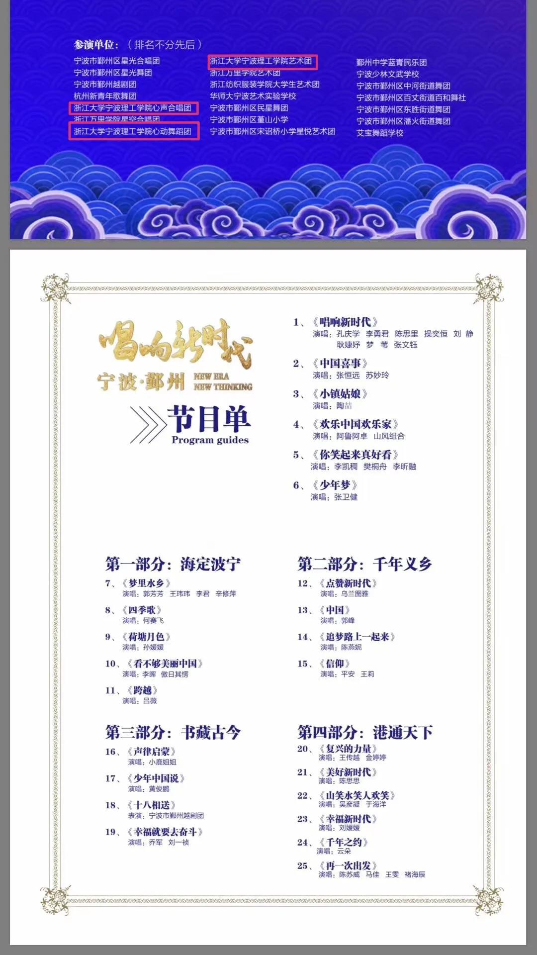 宁波鄞州场节目录制现场在鄞州区政府前广场,在登台的 25 个节目中演出者既有张卫健、云朵、陶喆、郭峰、阿鲁阿卓等明星大腕,也有本土的群众艺术团体,内容涵盖歌曲、舞蹈、越剧、情景舞剧等,雅俗共赏,展现了多姿多彩的宁波历史文化。学校艺术团的95位同学以合唱、伴舞的形式参与了鄞州场的6个节目。