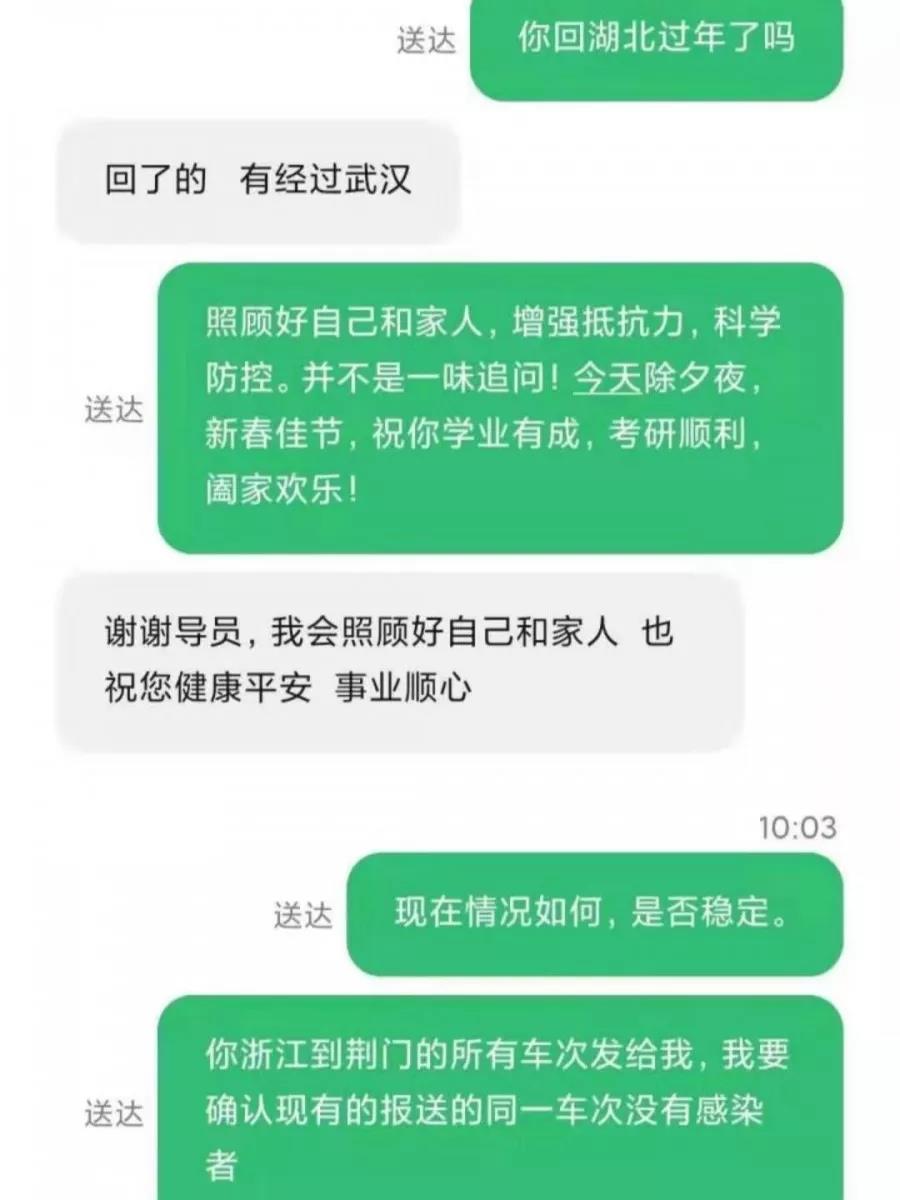 10478名学生无一遗漏,60名湖北籍学生每日关注,近千名温州籍和两百多名台州黄岩学生成为辅导员每天电话问候的对象,平均每个辅导员要打250个电话。辅导员每天睁开眼做的第一件事就是联系自己分管的学生,只有把情况了解清楚,同学们都身体无恙,才会感到心安。