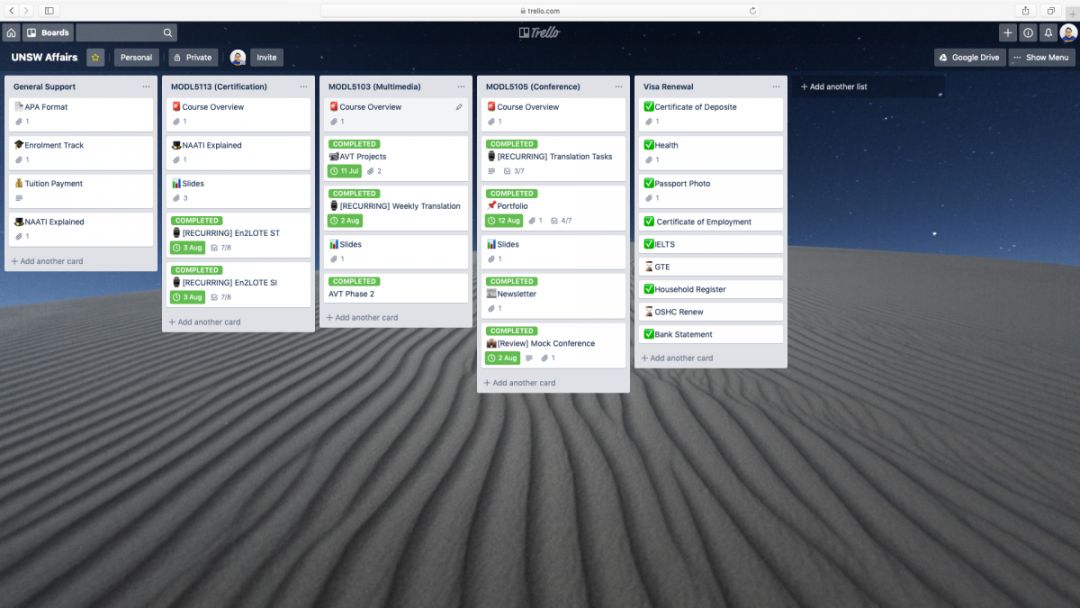 为了完成高强度大批量的课程作业,他开始使用trello网站做任务管理体系督促自己。在所有课程里,同声传译是公认的难度大。“同传对大脑的负担很大,一开始练同传的时候翻出来的中文都不是‘人话’,不过后来慢慢练就好了,需要2000个小时的录音练习”为了练好同传,厉修远每天都会抽出30分钟练习,没有一天懈怠,一个月后,他便开始慢慢跟得上课程了。