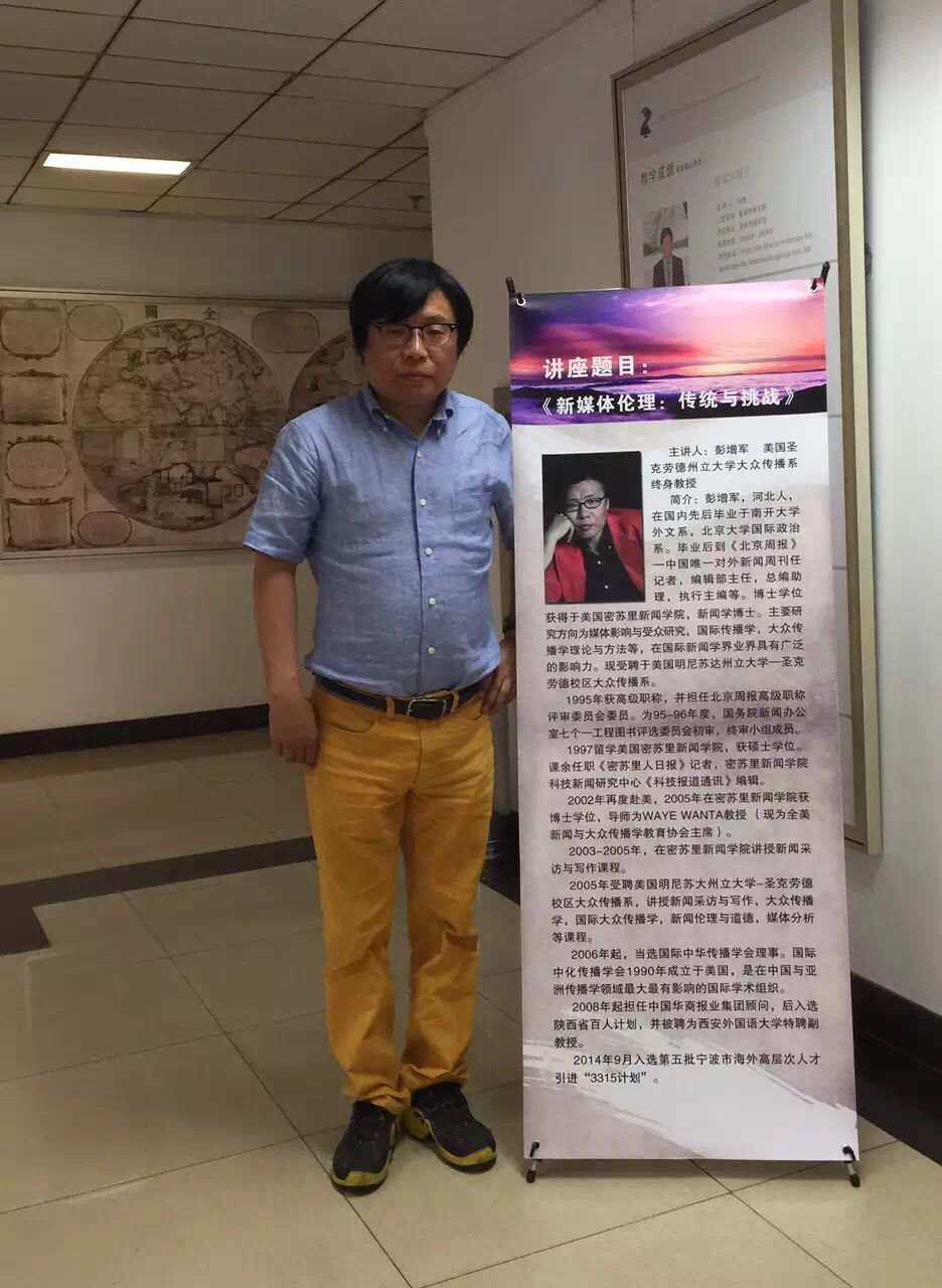 作为一名教授,彭增军老师曾在密苏里新闻学院担任《新闻采访与写作》的教学工作,现在他是浙江大学宁波理工学院三江学者,明尼苏达州圣克劳德州独立大学终身教授。在课堂上,他一直坚持“learning by doing的教学思维与方法。”