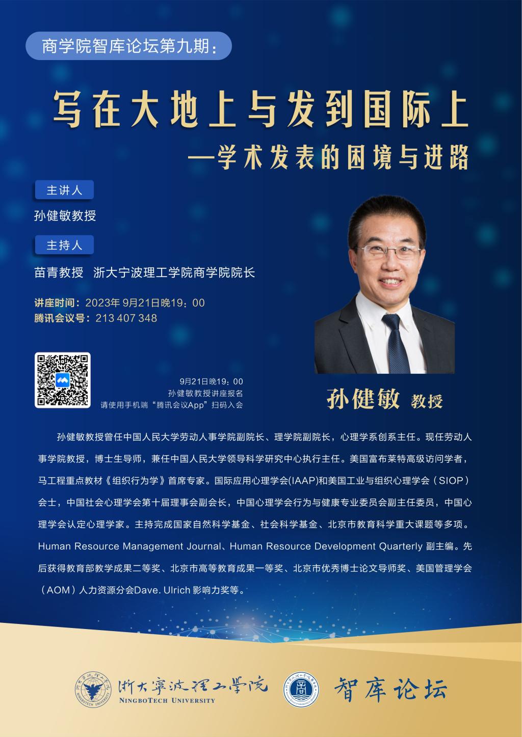 孙健敏教授曾任中国人民大学劳动人事学院副院长、理学院副院长,心理学系创系主任。现任劳动人事学院教授,博士生导师,兼任中国人民大学领导科学研究中心执行主任。美国富布莱特高级访问学者,马工程重点教材《组织行为学》首席专家。国际应用心理学会(IAAP)和美国工业与组织心理学会(SIOP)会士,中国社会心理学会第十届理事会副会长,中国心理学会行为与健康专业委员会副主任委员,中国心理学会认定心理学家。主持完成国家自然科学基金、社会科学基金、北京市教育科学重大课题等多项。Human Resource Management Journal、Human Resource Development Quarterly副主编。先后获得教育部教学成果二等奖、北京市高等教育成果一等奖、北京市优秀博士论文导师奖、美国管理学会(AOM)人力资源分会Dave. Ulrich影响力奖等。