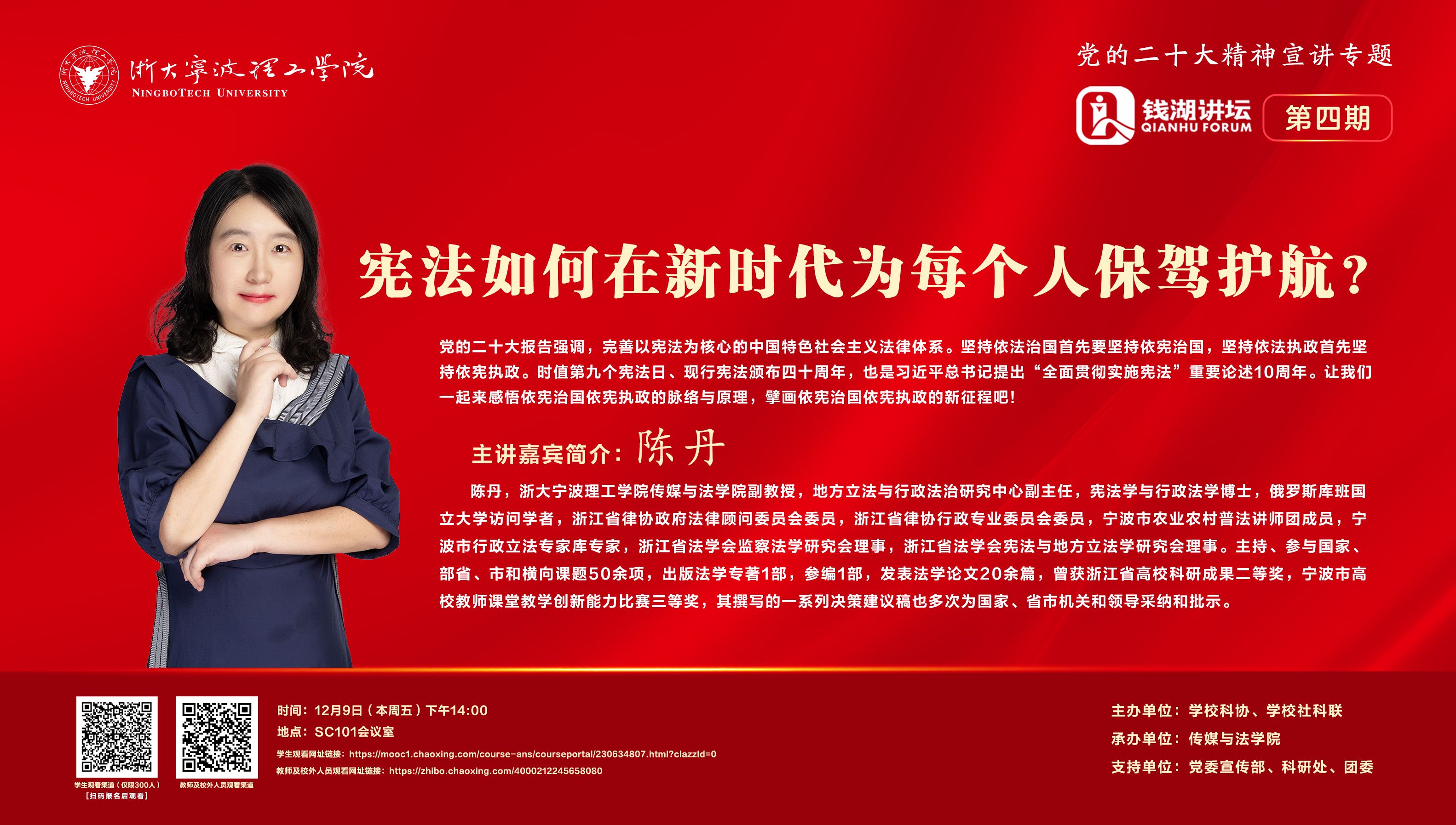 主讲嘉宾简介:陈丹,浙大宁波理工学院传媒与法学院副教授,地方立法与行政法治研究中心副主任,宪法学与行政法学博士,俄罗斯库班国立大学访问学者,浙江省律协政府法律顾问委员会委员,浙江省律协行政专业委员会委员,宁波市农业农村普法讲师团成员,宁波市行政立法专家库专家,浙江省法学会监察法学研究会理事,浙江省法学会宪法与地方立法学研究会理事。主持、参与国家、部省、市和横向课题50余项,出版法学专著1部,参编1部,发表法学论文20余篇,曾获浙江省高校科研成果二等奖,宁波市高校教师课堂教学创新能力比赛三等奖,其撰写的一系列决策建议稿也多次为国家、省市机关和领导采纳和批示。