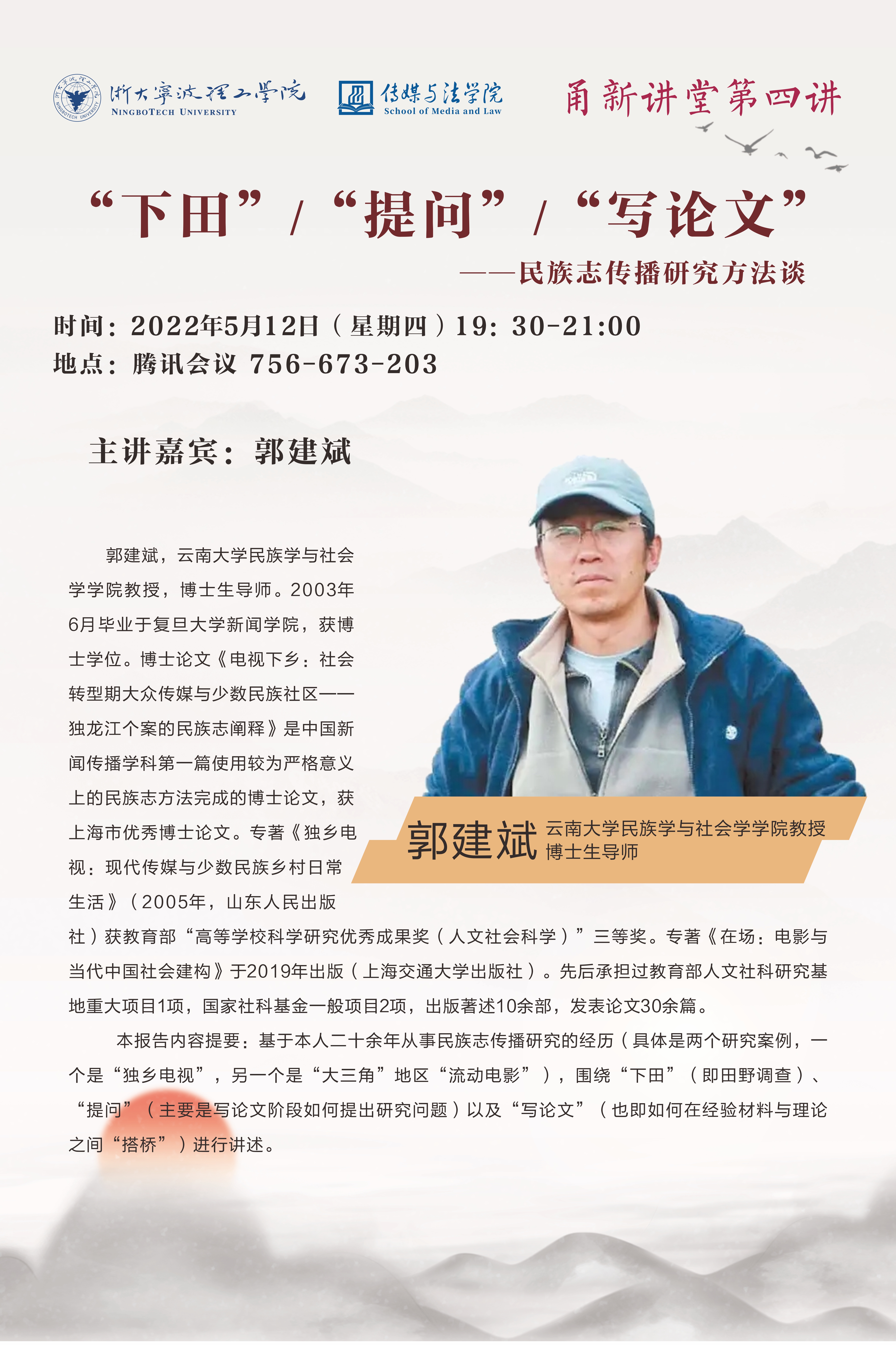主讲嘉宾简介:郭建斌,云南大学民族学与社会学学院教授,博士生导师。2003年6月毕业于复旦大学新闻学院,获博士学位。博士论文《电视下乡:社会转型期大众传媒与少数民族社区——独龙江个案的民族志阐释》是中国新闻传播学科第一篇使用较为严格意义上的民族志方法完成的博士论文,获上海市优秀博士论文。专著《独乡电视:现代传媒与少数民族乡村日常生活》(2005年,山东人民出版社)获教育部“高等学校科学研究优秀成果奖(人文社会科学)”三等奖。专著《在场:电影与当代中国社会建构》于2019年出版(上海交通大学出版社)。先后承担过教育部人文社科研究基地重大项目1项,国家社科基金一般项目2项,出版著述10余部,发表论文30余篇。