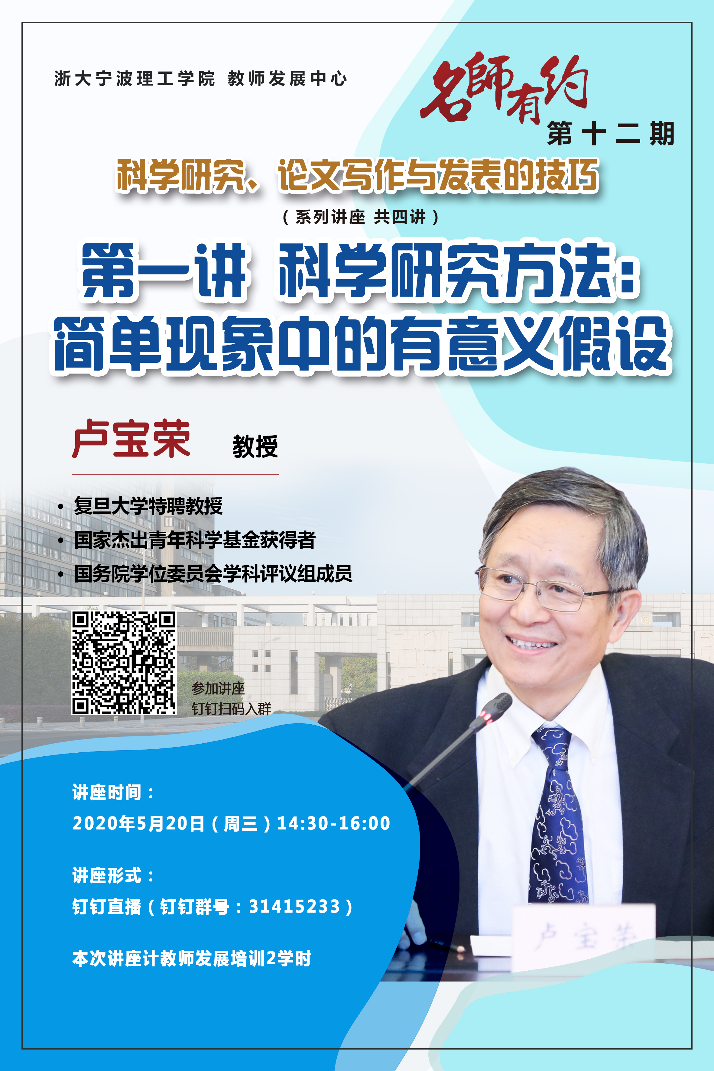 学校“名师有约”近期将推出“科学研究、论文写作与发表的技巧”系列讲座,特邀复旦大学特聘教授卢宝荣老师担任主讲嘉宾。该讲座共分四讲:(一)科学研究方法;(二)论文写作精要;(三)巧让数据说话;(四)成功发表论文。