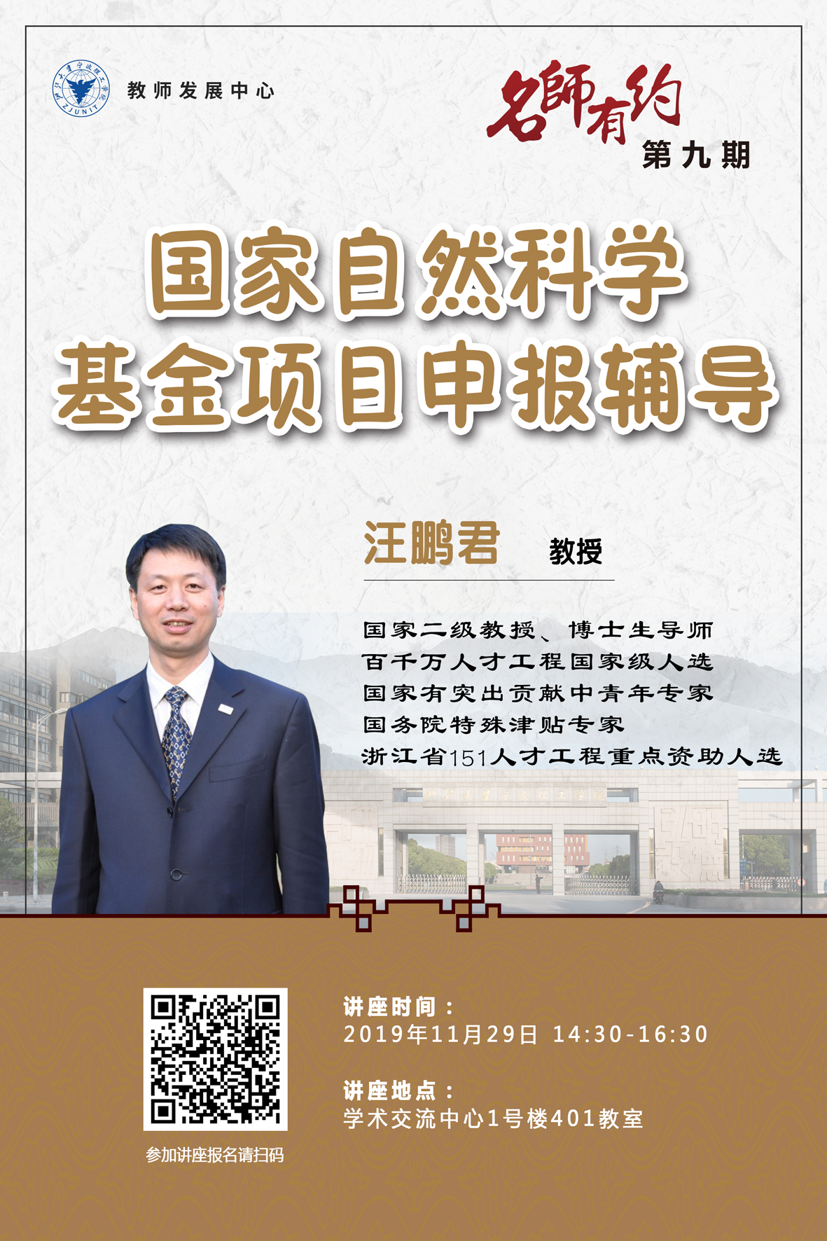 1. 请参加讲座的教师微信扫码报名,准时入场。