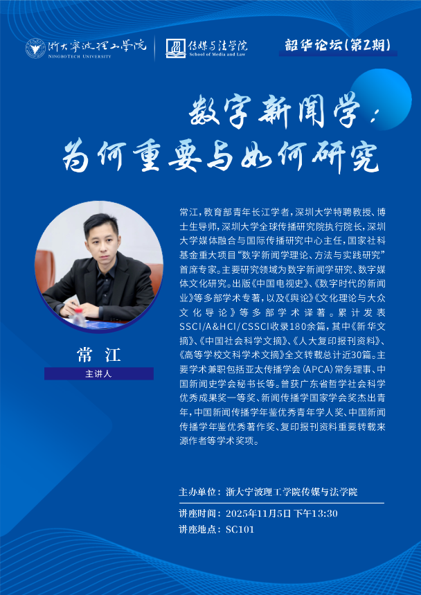 常江,深圳大学特聘教授、博士生导师,深圳大学全球传播研究院执行院长,深圳大学媒体融合与国际传播研究中心主任,国家社科基金重大项目“数字新闻学理论、方法与实践研究”首席专家。主要研究领域为数字新闻学研究、数字媒体文化研究。出版《中国电视史》《数字时代的新闻业》等多部学术专著,以及《舆论》《文化理论与大众文化导论》等多部学术译著。累计发表SSCI/A&HCI/CSSCI收录180余篇,其中《新华文摘》、《中国社会科学文摘》、《人大复印报刊资料》《高等学校文科学术文摘》全文转载总计近30篇。主要学术兼职包括亚太传播学会APCA)常务理事、中国新闻史学会秘书长等。曾获广东省哲学社会科学优秀成果奖一等奖、新闻传播学国家学会奖杰出青年,中国新闻传播学年鉴优秀青年学人奖、中国新闻传播学年鉴优秀著作奖、复印报刊资料重要转载来源作者等学术奖项。