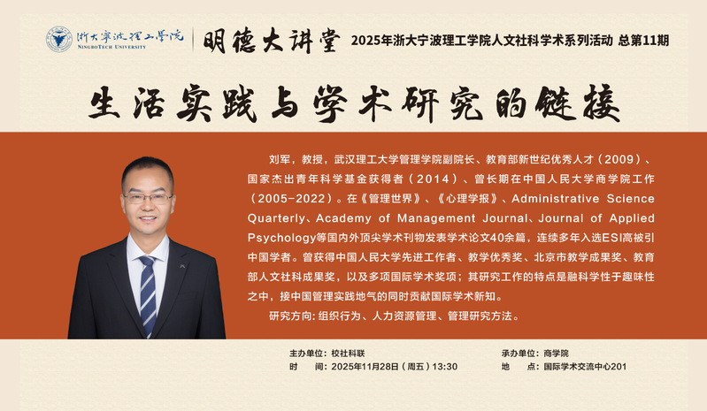 刘军,教授,武汉理工大学管理学院副院长、教育部新世纪优秀人才(2009)、国家杰出青年科学基金获得者(2014)、曾长期在中国人民大学商学院工作(2005-2022)。在《管理世界》、《心理学报》、Administrative ScienceQuarterly、Academy of Management Journal、Journal of AppliedPsychology等国内外顶尖学术刊物发表学术论文40余篇,连续多年入选ESI高被引中国学者。曾获得中国人民大学先进工作者、教学优秀奖、北京市教学成果奖、教育部人文社科成果奖,以及多项国际学术奖项;其研究工作的特点是融科学性于趣味性之中,接中国管理实践地气的同时贡献国际学术新知。