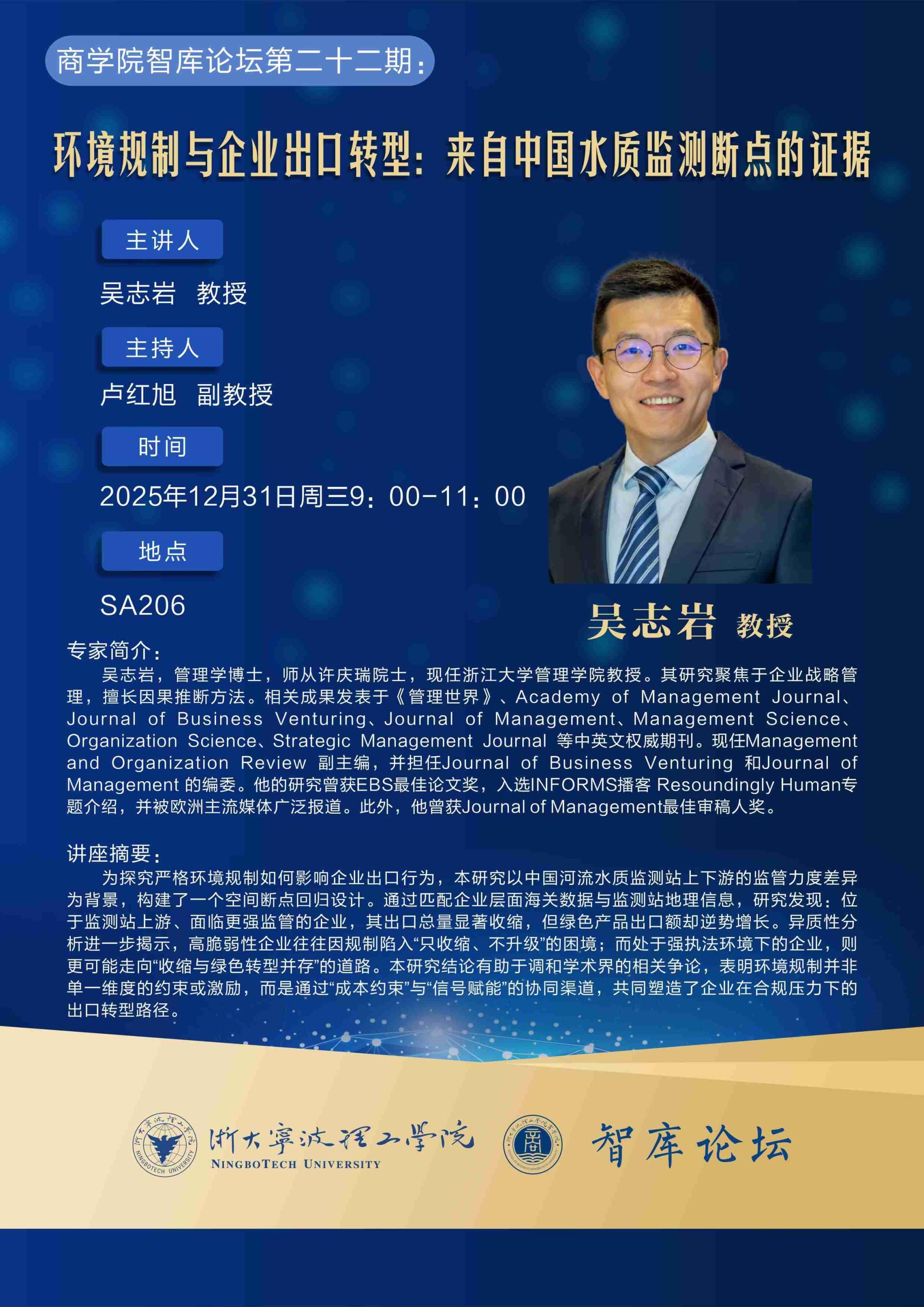 吴志岩,管理学博士,师从许庆瑞院士,现任浙江大学管理学院教授。其研究聚焦于企业战略管理,擅长因果推断方法。相关成果发表于《管理世界》、Academy of Management Journal、Journal of Business Venturing、Journal of Management、Management Science、Organization Science、Strategic Management journal 等中英文权威期刊。现任Managementand Organization Review 副主编,并担任Journal of Business Venturing 和Journal ofManagement 的编委。他的研究曾获EBS最佳论文奖,入选INFORMS播客 Resoundingly Human专题介绍,并被欧洲主流媒体广泛报道。此外,他曾获JournalofManagement最佳审稿人奖。