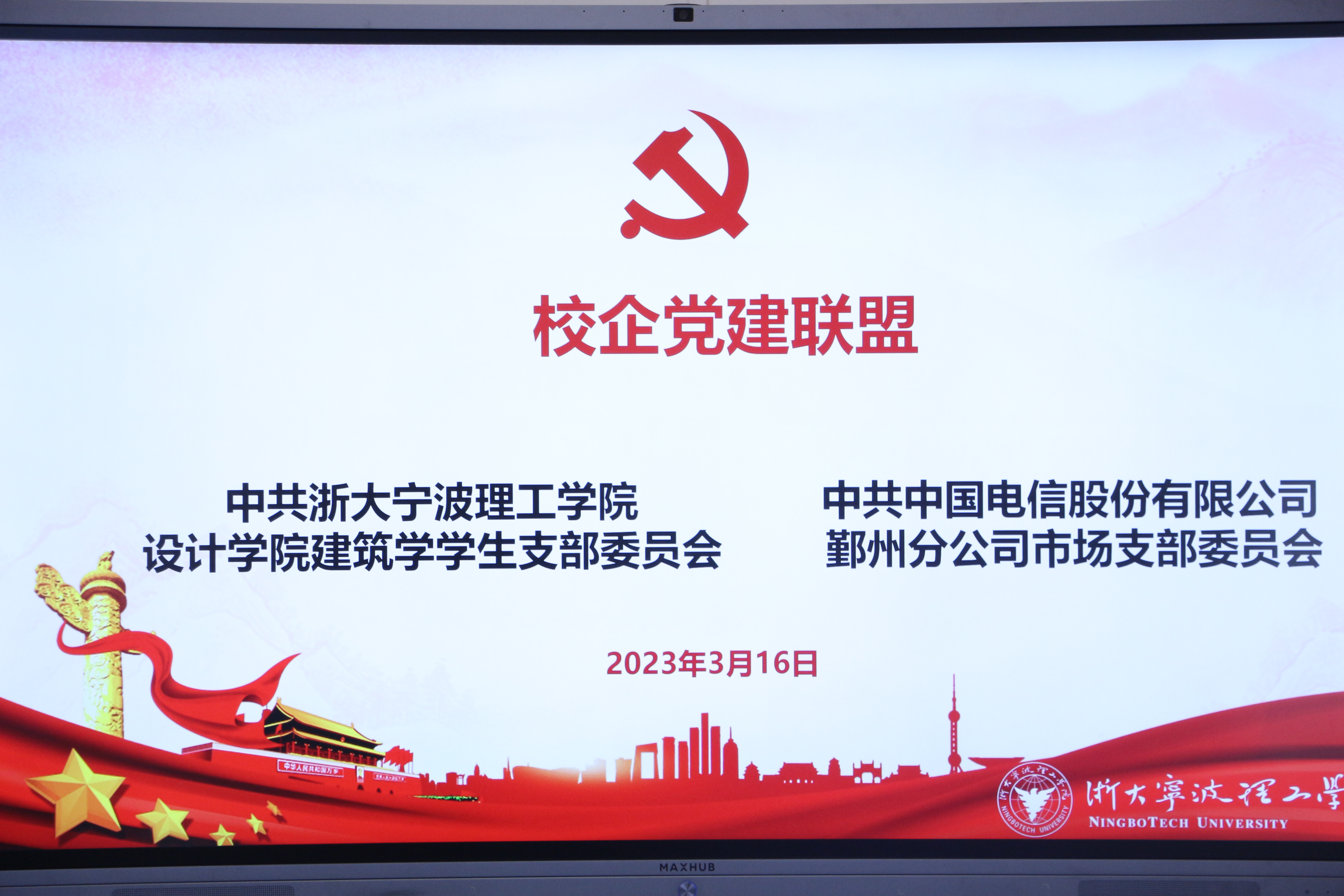 为深入贯彻落实党的二十大精神,加强产学研合作,提高学生就业核心竞争力,推进毕业生重点领域就业,3月16日下午,设计学院与中国电信股份有限公司鄞州分公司在SE306会议室举行校企党建联盟签约仪式。中国电信股份有限公司鄞州分公司党委委员、副总经理王俞赛,市场党支部书记邵海江,组织委员施琼英,纪检兼宣传委员李斌,分公司党委办干事蔡萍萍;设计学院负责人、教师代表及建筑学学生党支部党员参加。会议由建筑学学生党支部书记周鑫磊主持。