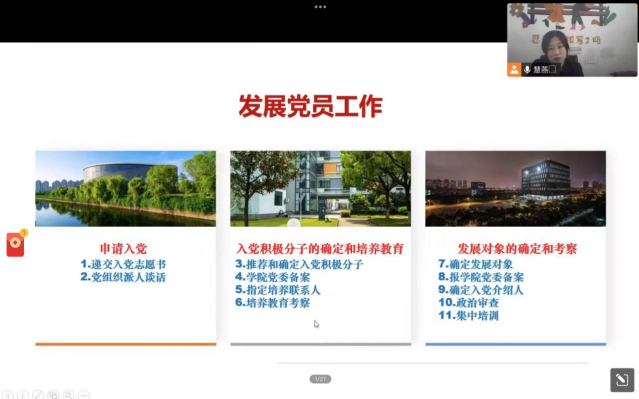 金慧燕首先介绍了党支部工作流程和主要工作内容,强调了党支部的职责和使命,使同学们对党支部有了更为准确的认识。随后,她从入党申请、入党积极分子的确定和培养、发展对象的确定和考察,到预备党员的接收、考察和转正等入党流程进行了详尽的讲解。“老师,我不是共青团员,能递交入党申请书吗?”“老师,入党要求是学生干部吗?”……大家纷纷留言。针对同学们提出的问题,金慧燕进行了耐心的解答,让同学们对入党有了更加深入的了解和规划。最后,她寄语同学们积极向党组织靠拢,有一份光,发一份热,不忘入党初心,让奋斗成为青春的底色。