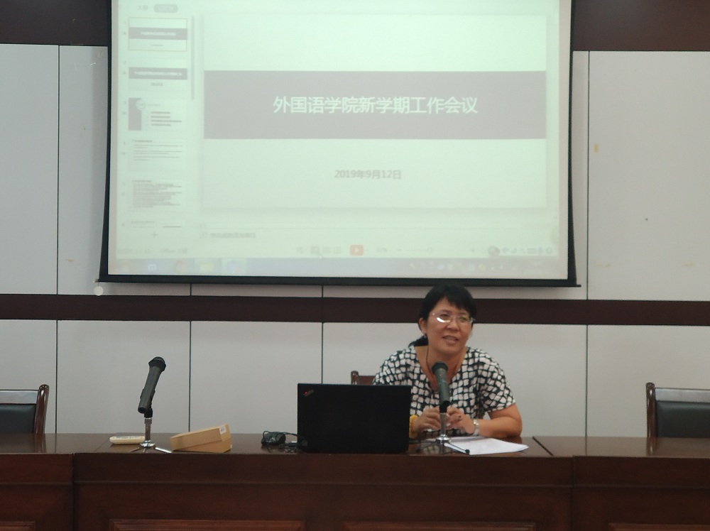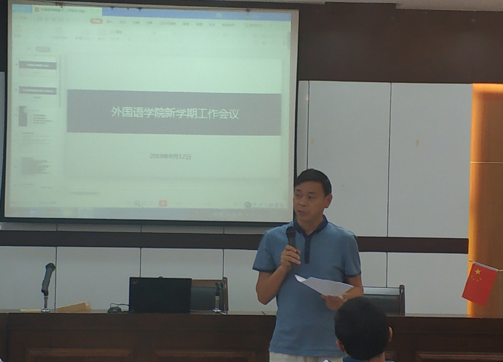 9月12日下午1点30分,外国语学院在SC405会议室召开了新学期工作会议,学院班子成员及全体教职工参加了此次会议。会议由学院党委副书记傅晓宇老师主持。