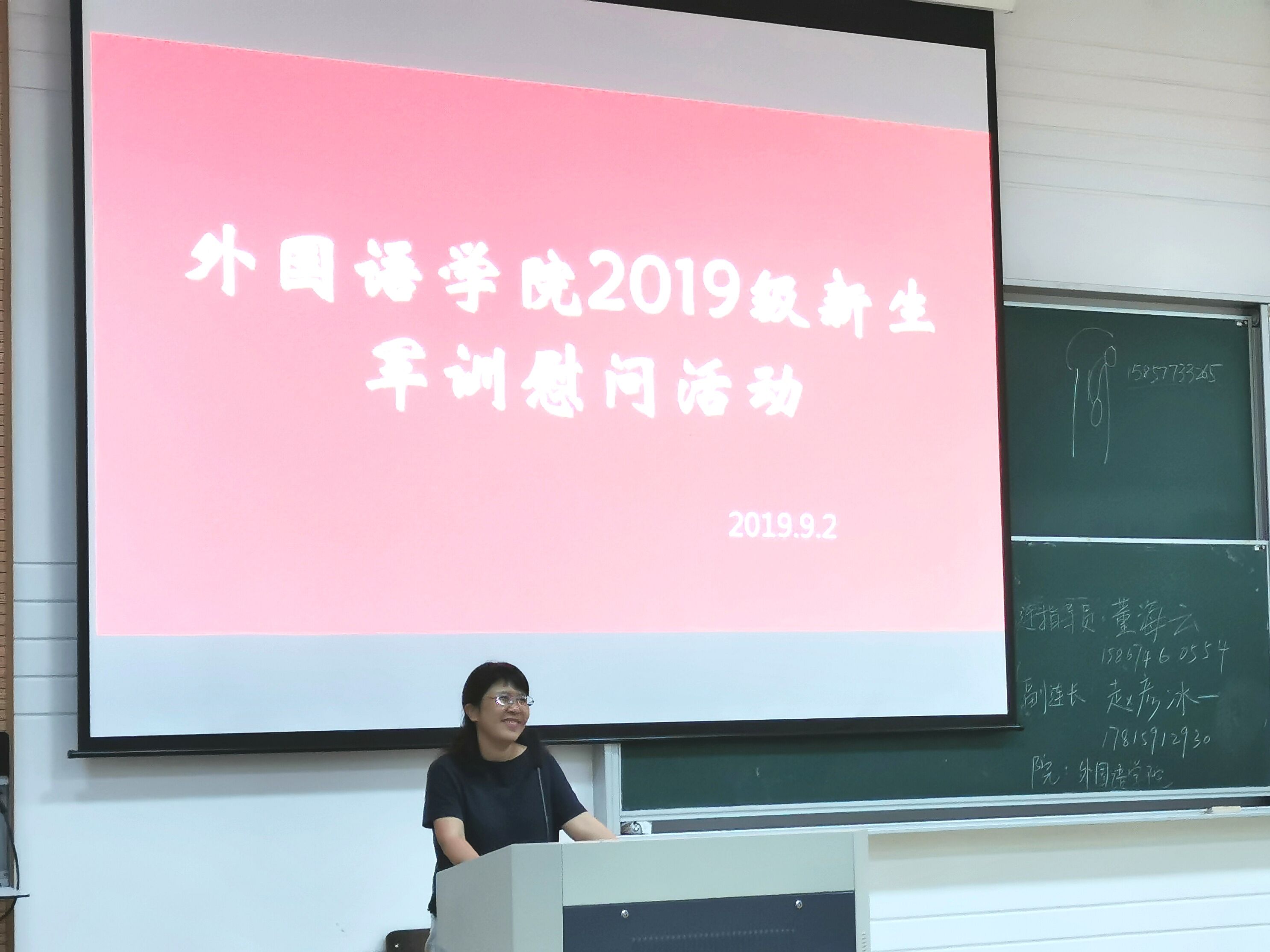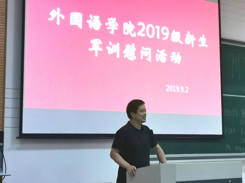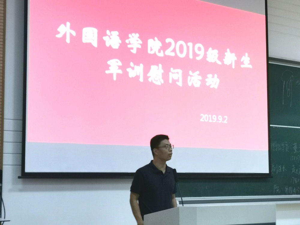 秋雨无情至,慰问有情来。9月2日下午4点,外国语学院2019级新生军训慰问活动于SB102多媒体教室举行。外国语学院党委副书记傅晓宇、副院长周汶、党委副书记任凯、思政副主管刘杜娟及班导师孙娟、周文等出席此次活动,本次会议由辅导员董海云老师主持。
