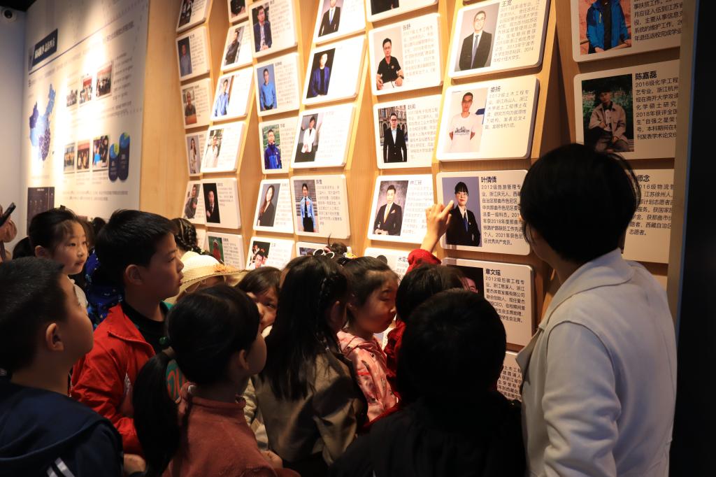 上午10点,小朋友们在大学生志愿者的引导下游览浙大宁波理工学院校园。“有谁想要成为一名气象学家?”在竺可桢雕像前,孩子们纷纷举起自己的手。校史馆的参观过程中,大学生讲解员对学校的发展历程、荣誉成就、学科建设、杰出校友、创新作品等内容进行了详细介绍,孩子们听得津津有味。