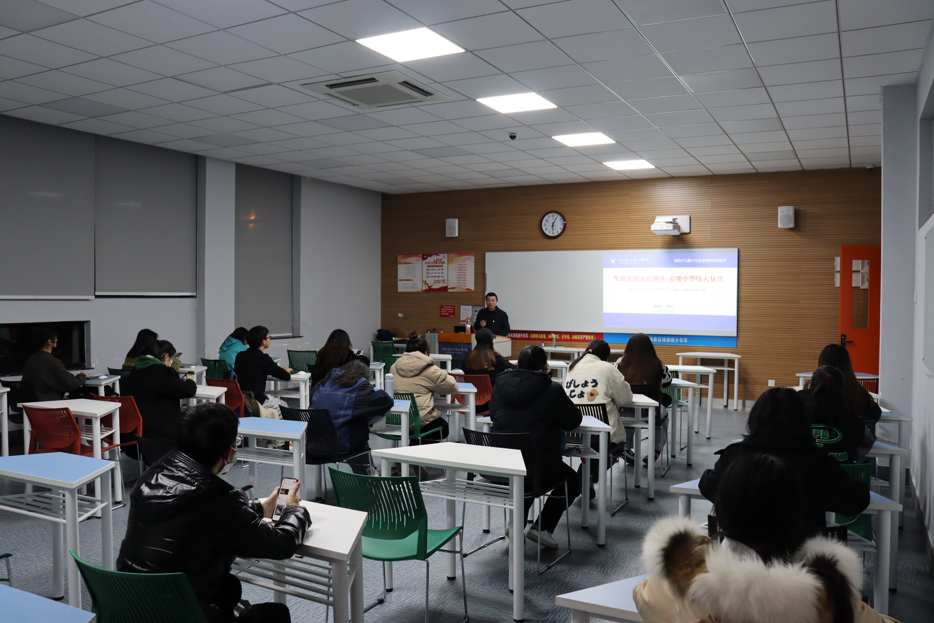 为深入学习贯彻党的十九届六中全会精神,浙大宁波理工学院传媒与法学院举行了党的十九届六中全会精神系列宣讲活动。2021年12月21日晚,学院入党积极分子开展了学习贯彻党的十九届六中全会精神活动,邀请了学校纪委副书记、纪检监察室主任张杰老师为积极分子代表讲课。