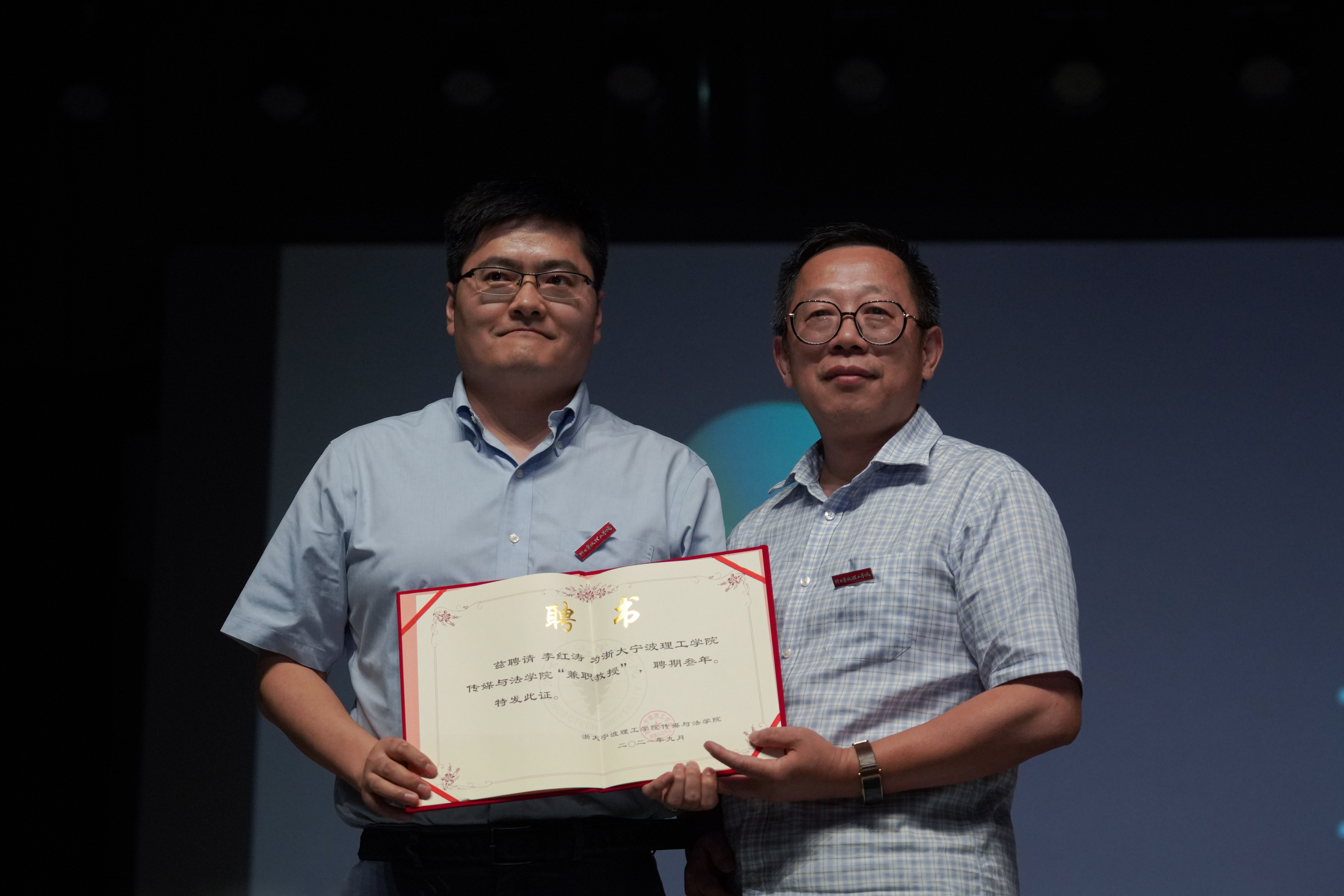 随后,吴飞院长为学院兼职教授李红涛颁发聘书并佩戴校徽,对学院新人才的加入表示热烈欢迎。李红涛教授感谢浙大宁波理工学院对他的信任和支持,受聘传媒与法学院兼职教授深感荣幸,但是更感觉到这是一种责任,期待未来与学院有更多的合作与交流,为学校发展贡献自己的智慧和力量。