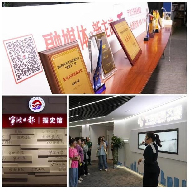 在吴华清的带领下,同学们在报史馆参观《宁波日报》的迁移史和发展史,对报纸印刷流程、经典新闻事件、媒体融合探索进行深入了解。一条长廊,承载着宁波报业的过往,述说着《宁波日报》四十多年来向涛而立的发展脉络。在报史馆,眼前一排排老式印刷机、传统纸质报纸、老式黑白胶片机以及宁波城市记忆,展现《宁波日报》的点点滴滴;展板上呈现的优秀新闻报道伴随着一块块奖牌、一座座奖杯,闪耀着《宁波日报》铸就的辉煌。听着吴老师的讲解,同学们了解到宁波日报与宁波城市的密切联系,学习到作为一名新闻工作者的社会责任与担当。